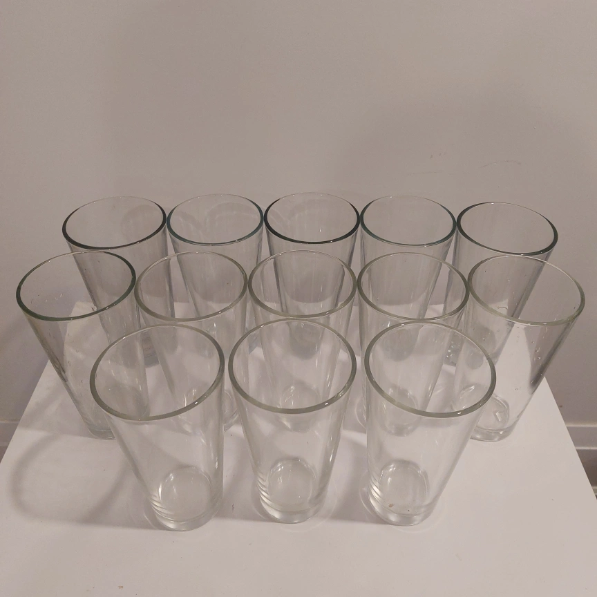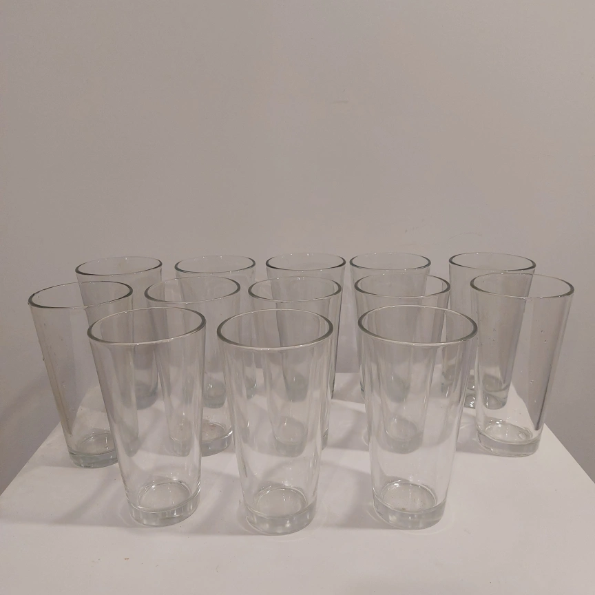 Set of twelve clear glass tumblers. Perfect for everyday use or entertaining. Tall and slender design.