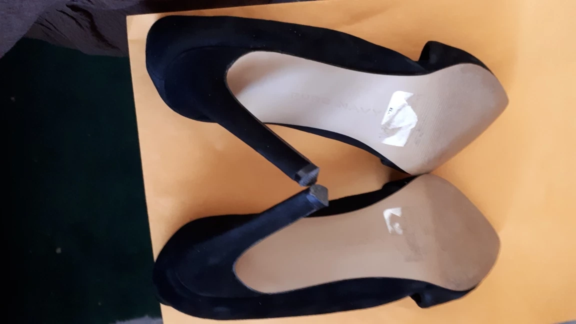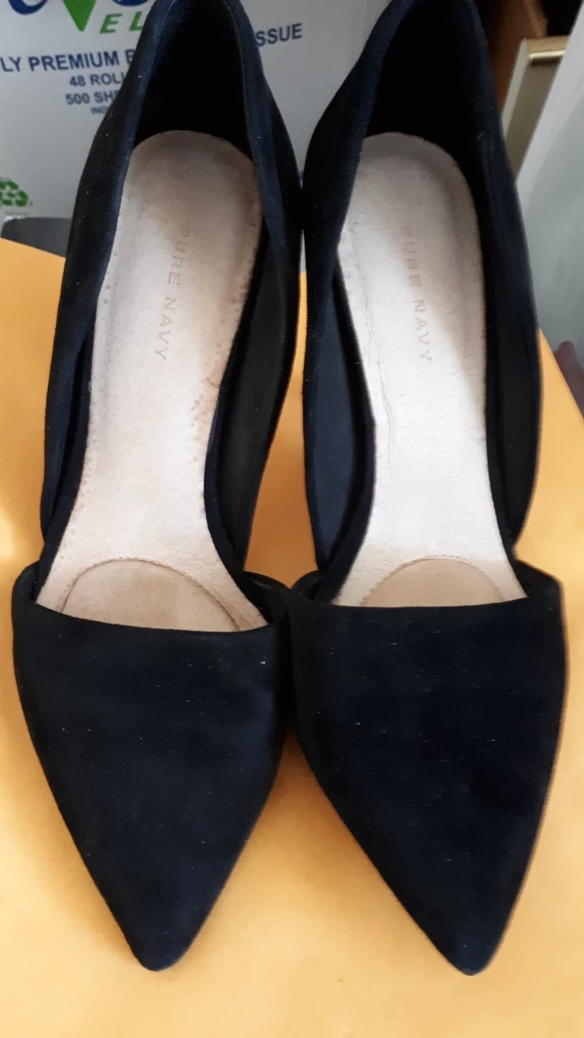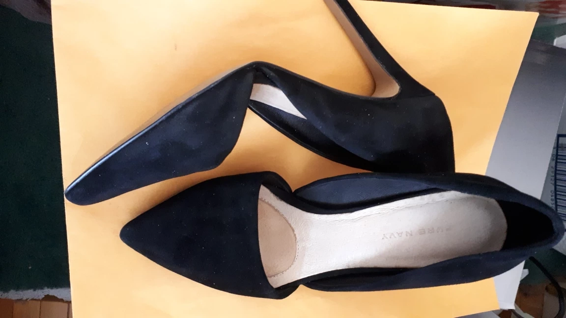 Pair of black suede high heels. Pointed toe and cut-out sides. Slight heel wear.