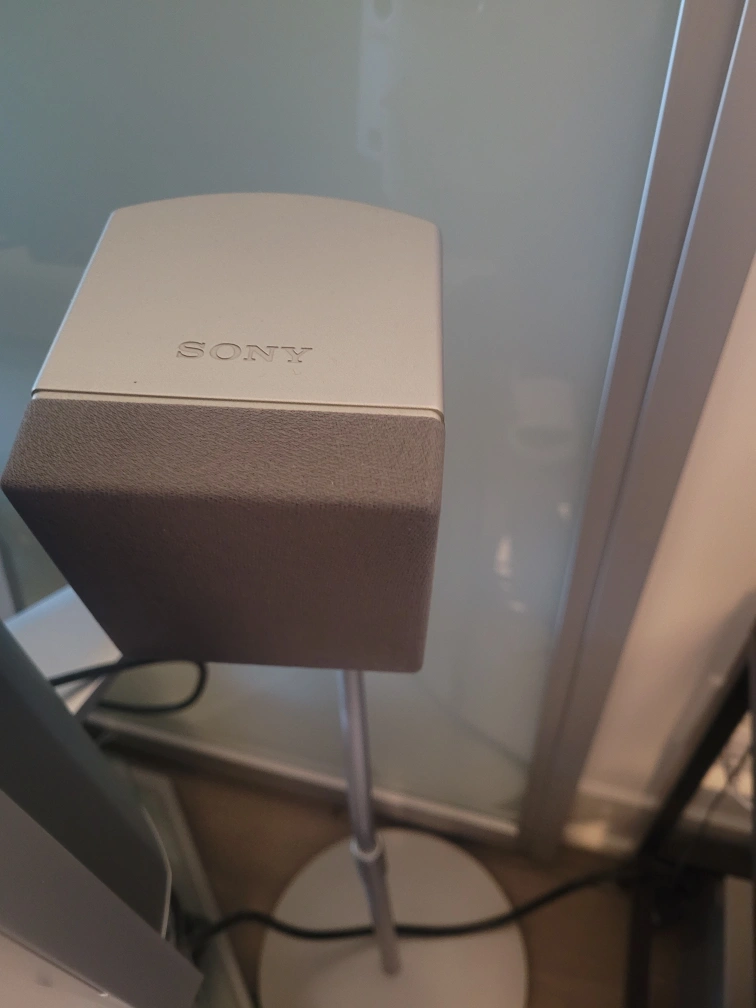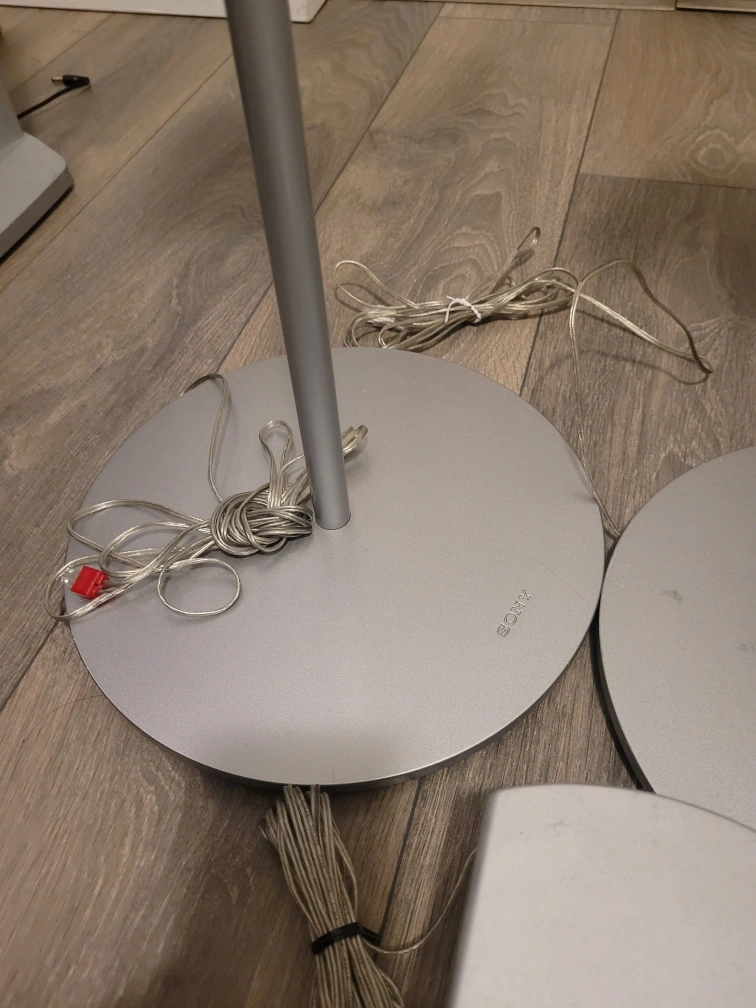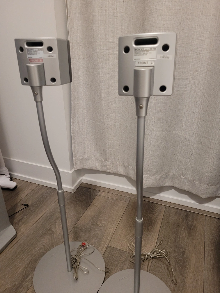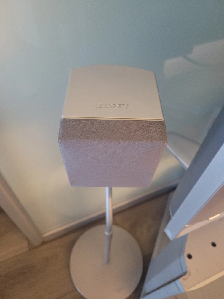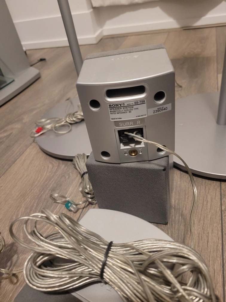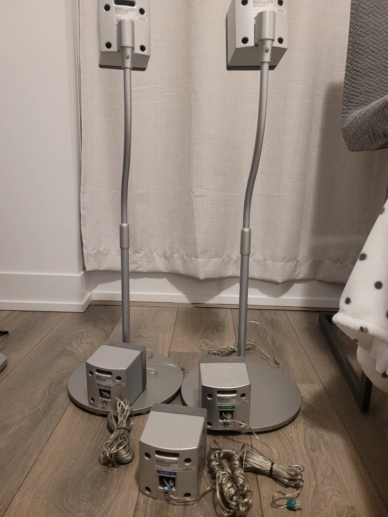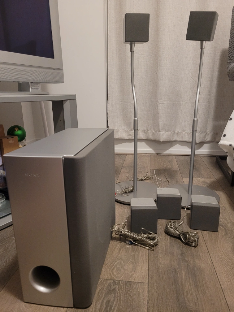 Silver and grey Sony home theatre speakers. Includes subwoofer and two satellite speakers. Great sound quality. Pre-owned.