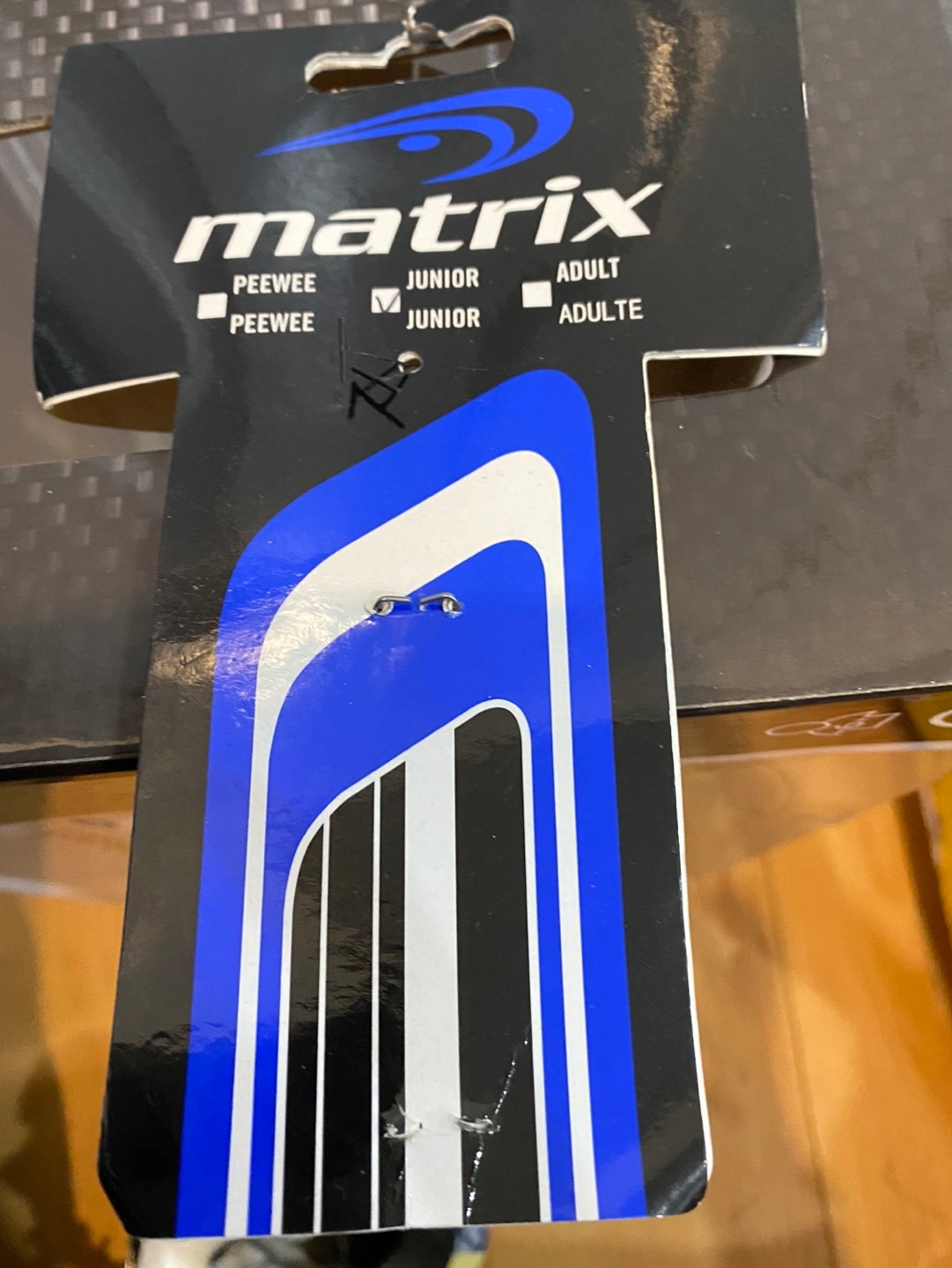 Pair of Matrix brand junior soccer shin guards. Black with blue accents. Pick up on 34th E Ave & Victoria Drive, Vancouver