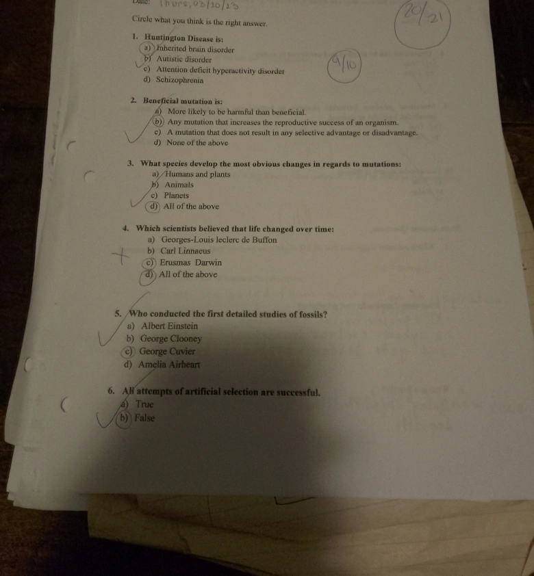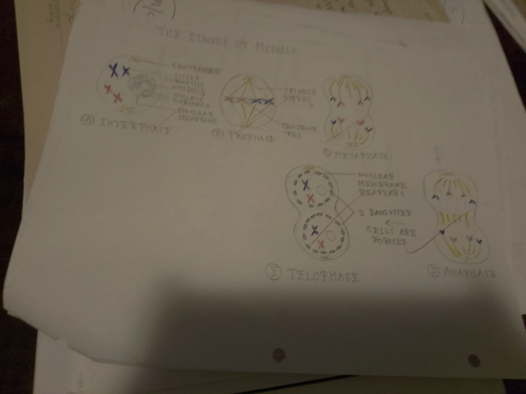 Handwritten biology notes. Covers mitosis phases and genetics questions. Includes diagrams and multiple choice questions. Good for studying.