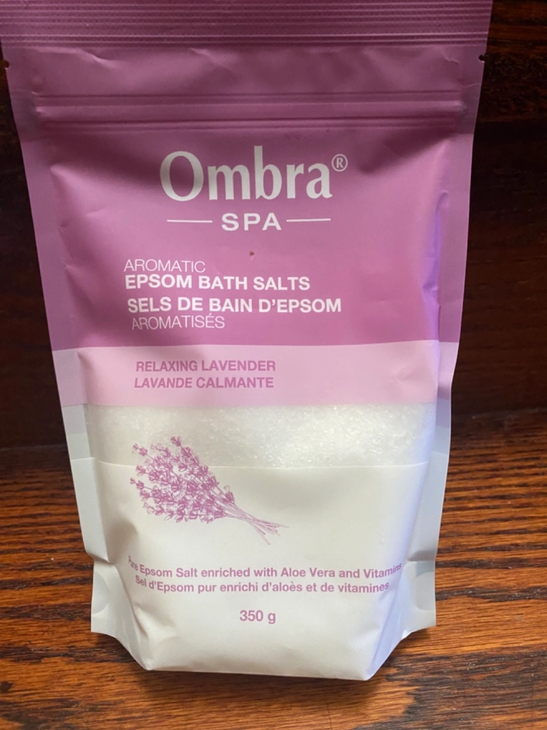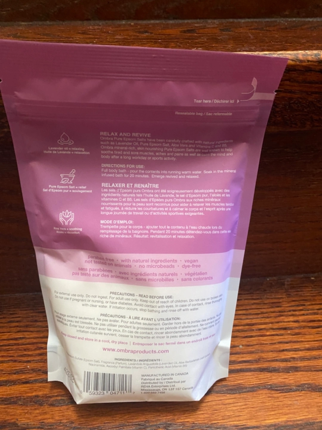 350g bag of Ombra Spa Epsom bath salts. Relaxing lavender scent. Enriched with aloe vera and vitamins. Paraben-free, dye-free, vegan. Cash Only