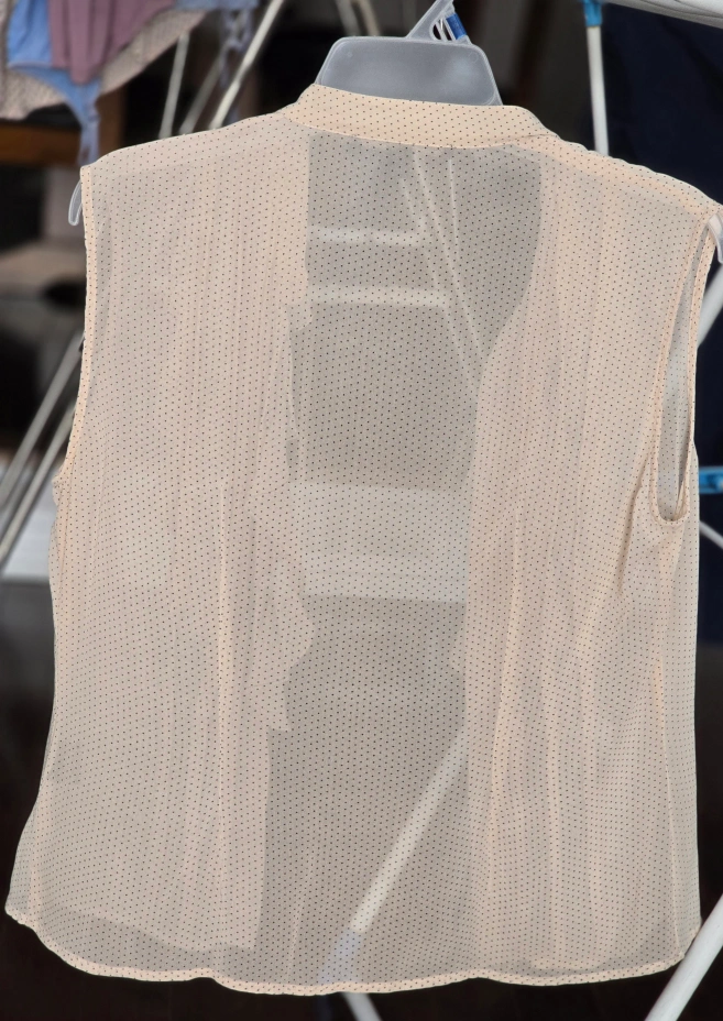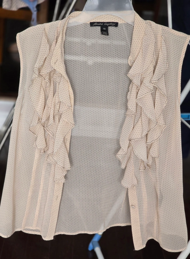 Cream coloured sleeveless blouse. Size M. 100 % silk fabric with black polka dots. Ruffled detailing at the front. Made in China.