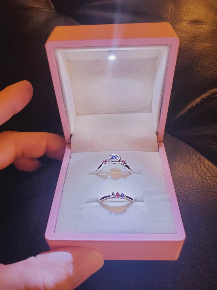 Beautiful ring set. Features two rings, one with a crescent moon and small stones, the other with three small stones. Sterling silver .925 with czs. Inspired by Lord Sesshomaru. Comes in a pink box with a cleaning cloth and pouch.