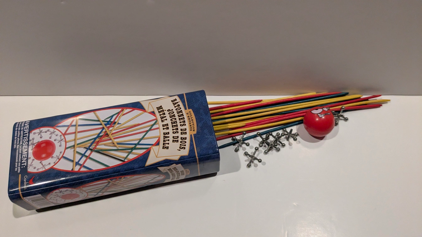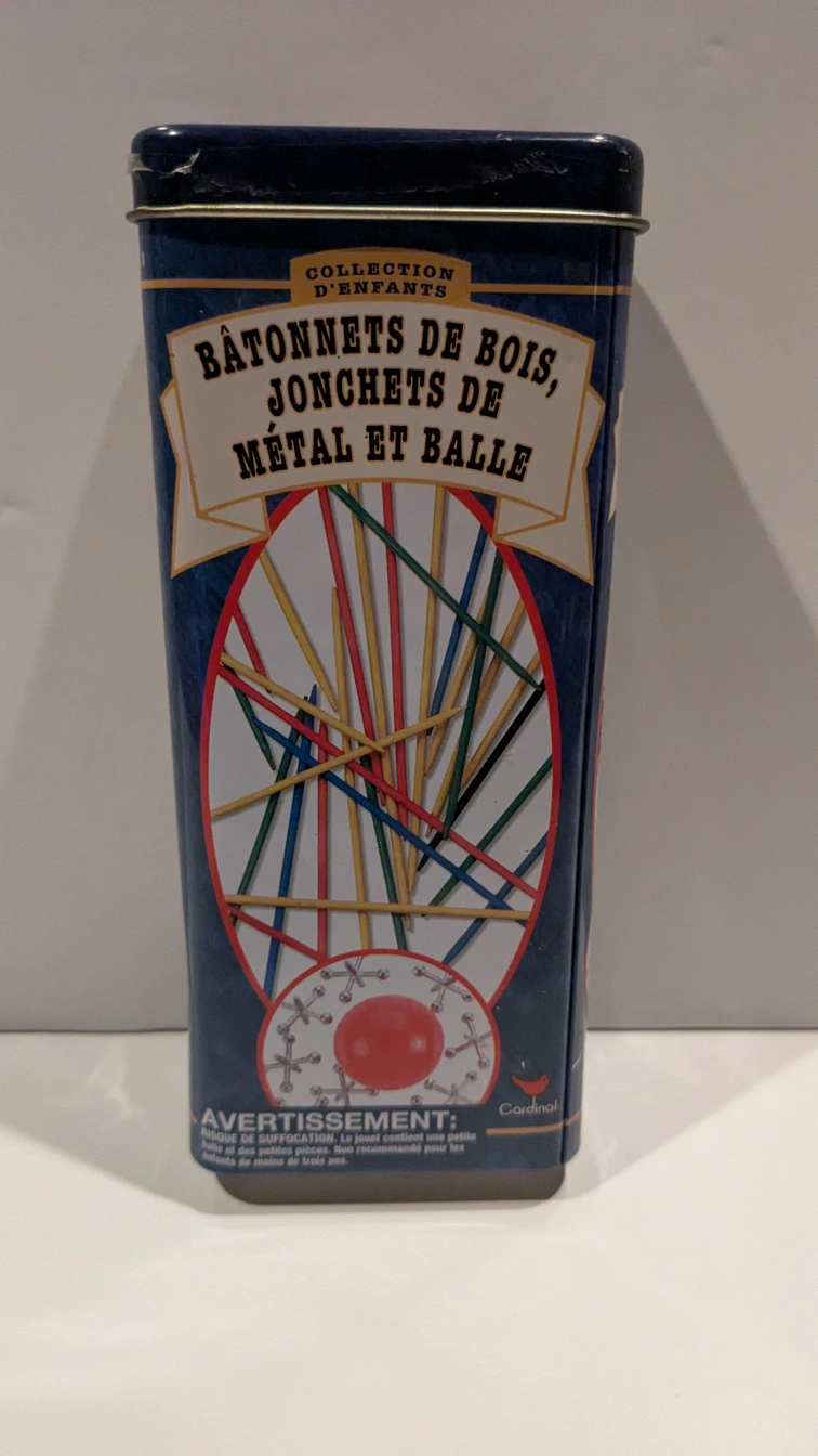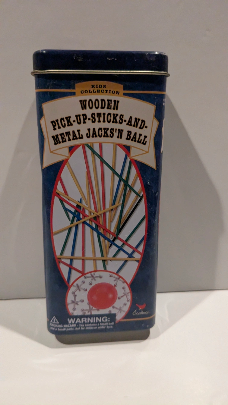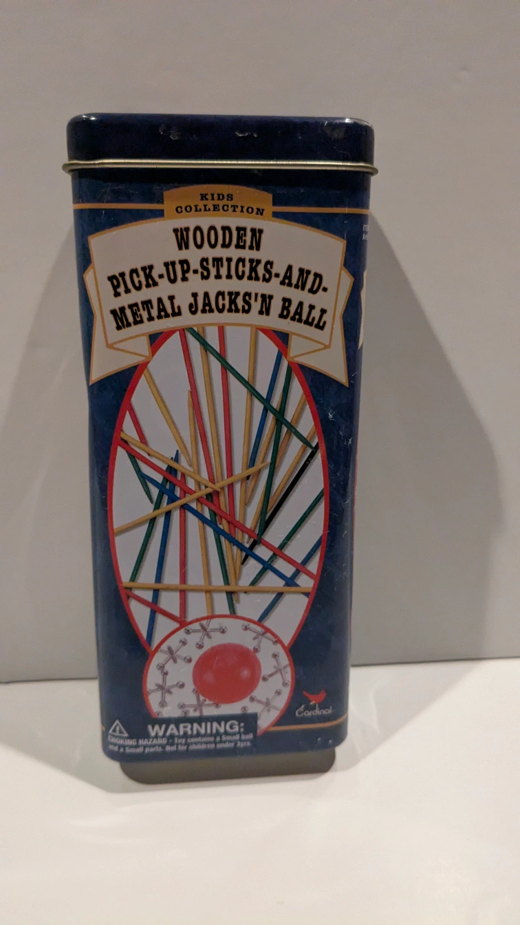 Collectible tin game. Includes wooden pick-up sticks, metal jacks, and a ball. Kids' collection. Great for travel or game night. I have other vintage games listed. Please see my other listings. Thank you for looking at our listing. We always welcome questions . From a smoke-free home.