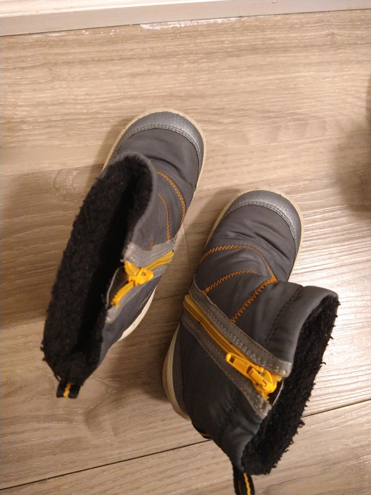 Pair of grey kids' winter boots. Features yellow zippers and black fleece lining. Lightweight and warm.