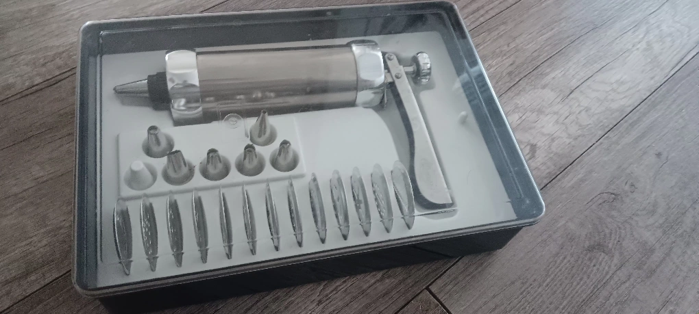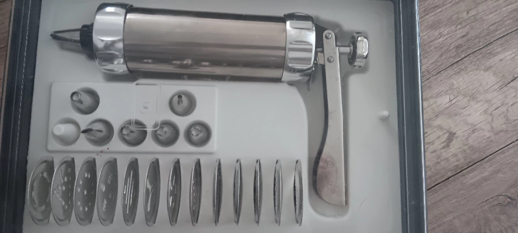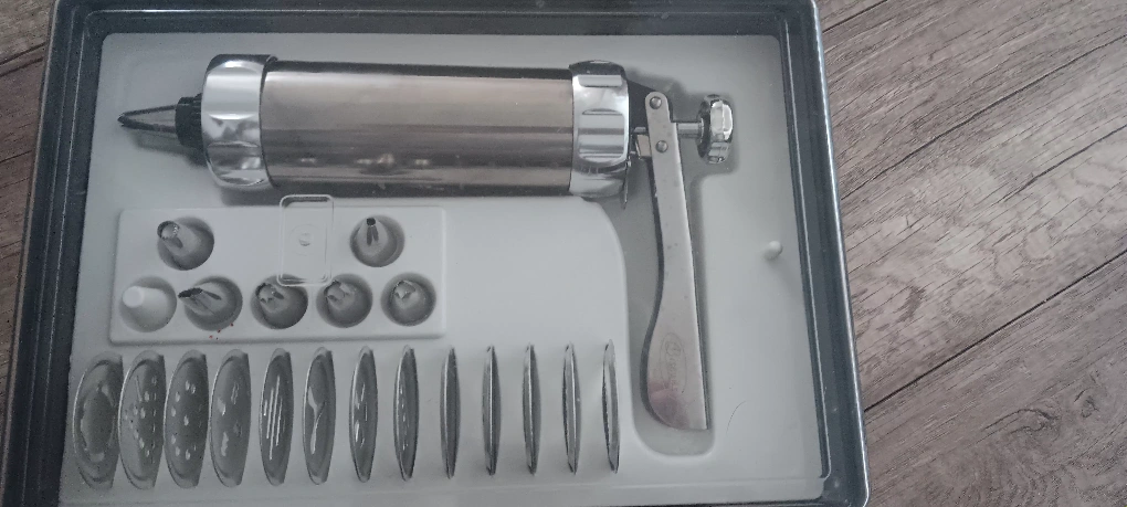 Stainless steel cookie press. Includes various tips and decorating discs. Great for baking and decorating cookies.