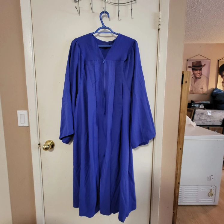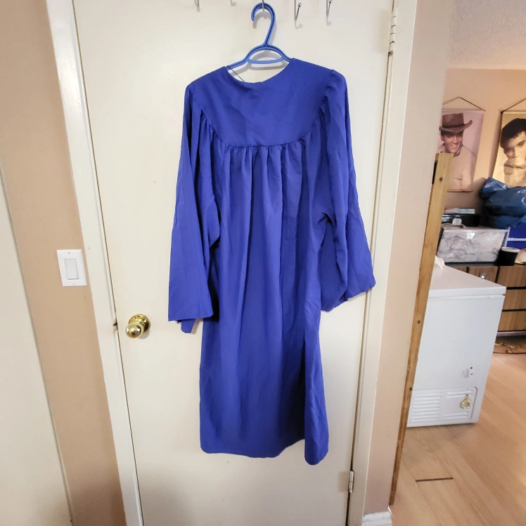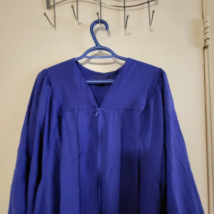 Long-sleeved royal blue graduation gown. Features a zipper closure and a classic design. Great for graduation ceremonies. Smoke free home Rossland and Stevenson north