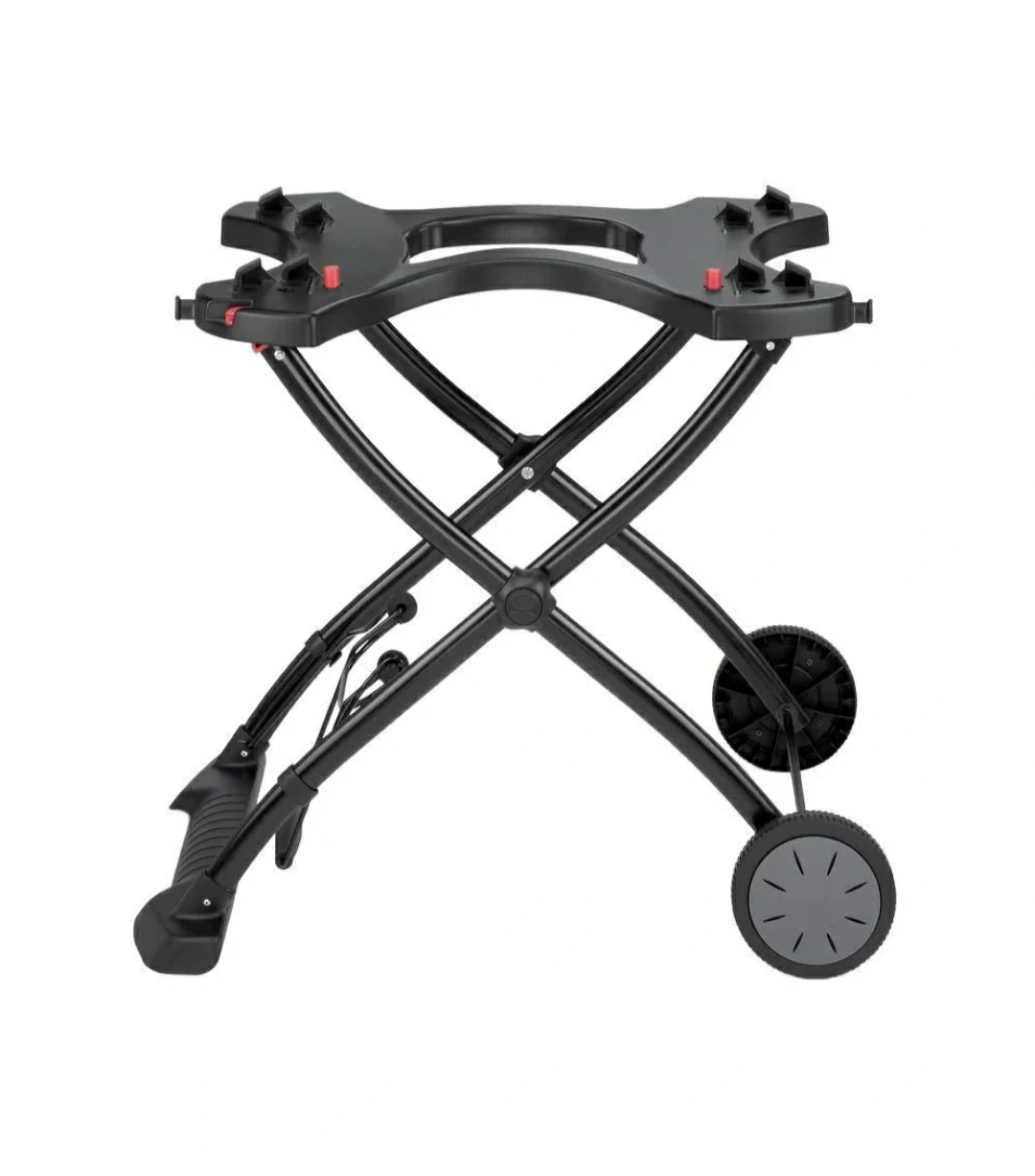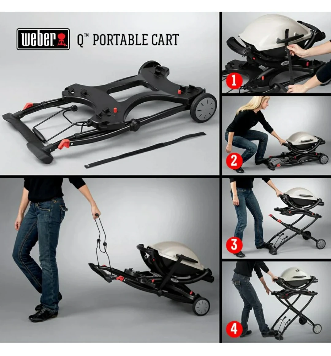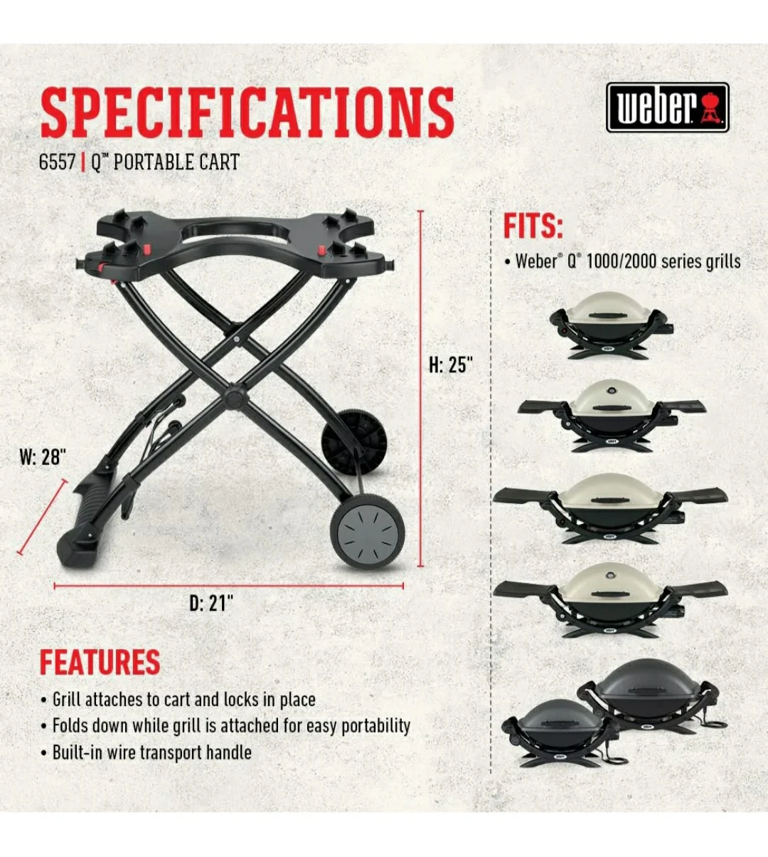 Weber Q Folding BBQ Cart BRAND NEW IN BOX $85 MODEL NUMBER 6557 5 AVAILABLE BRAND NEW IN BOX At home or on the go, rely on the portable Weber Cart. Simply push a button to switch from grilling to transport mode. Built to last with sturdy wheels and built-in utensil hooks, this cart will allow you to g, Little assembly required. Its front-loading design allows you to lock the grill in place. With the push button, you get easy storage and portability and the barbecue remains attached to the cart. Includes two all-weather wheels and two integrated utensil hooks.