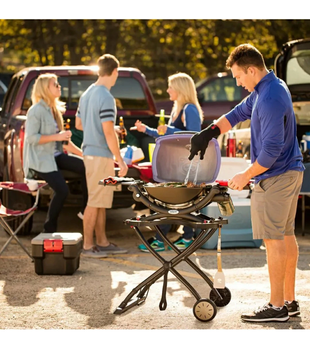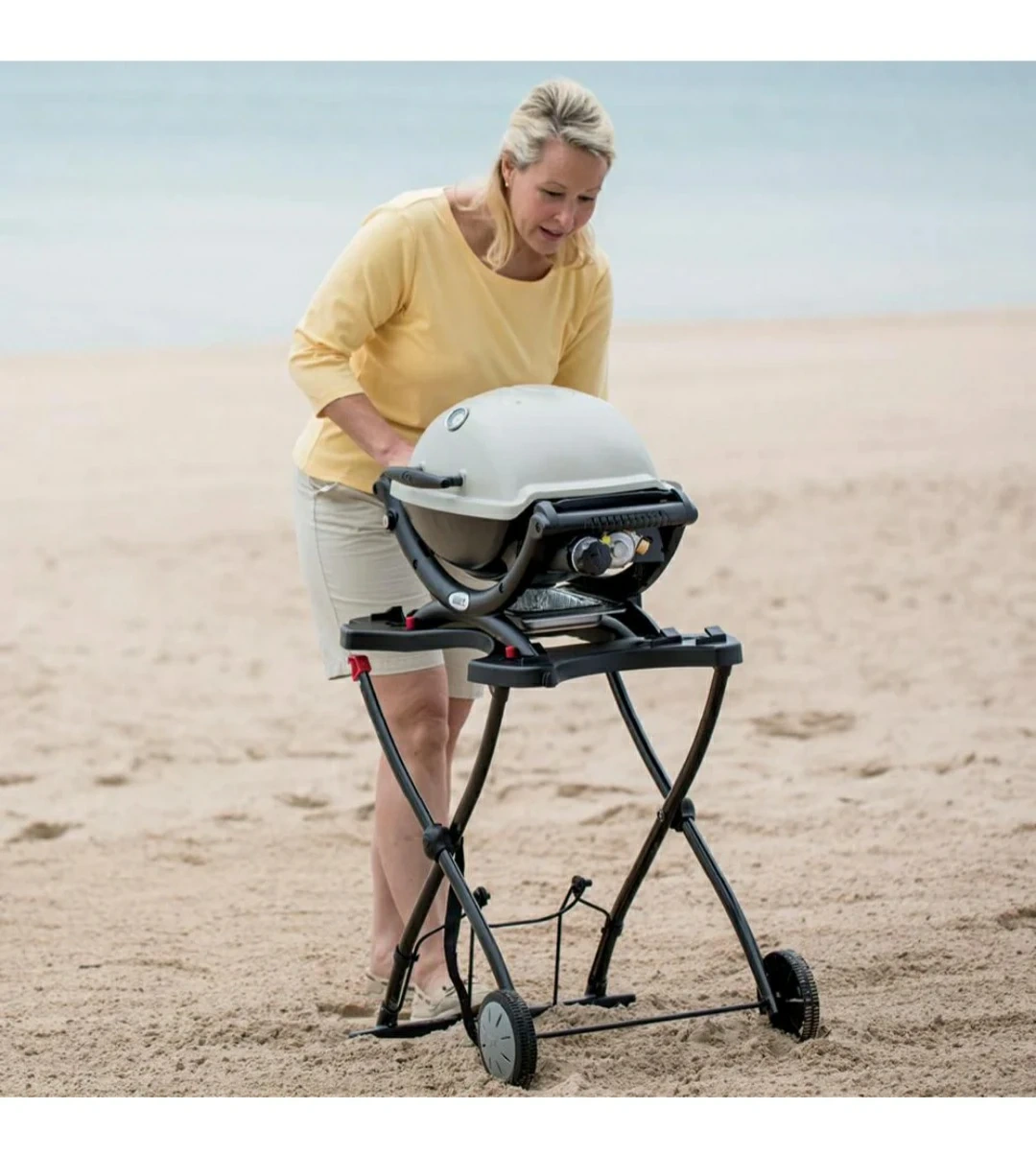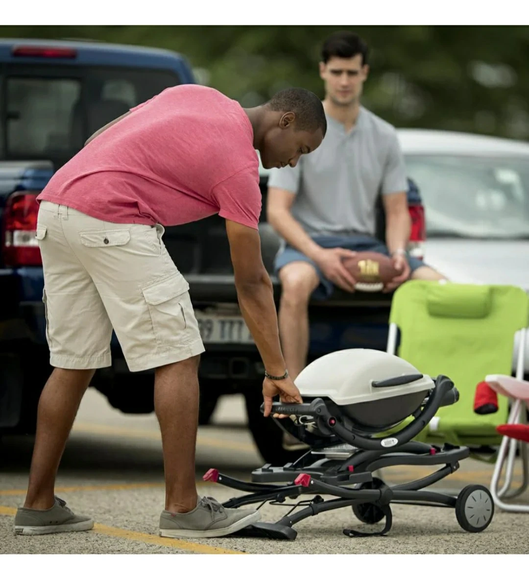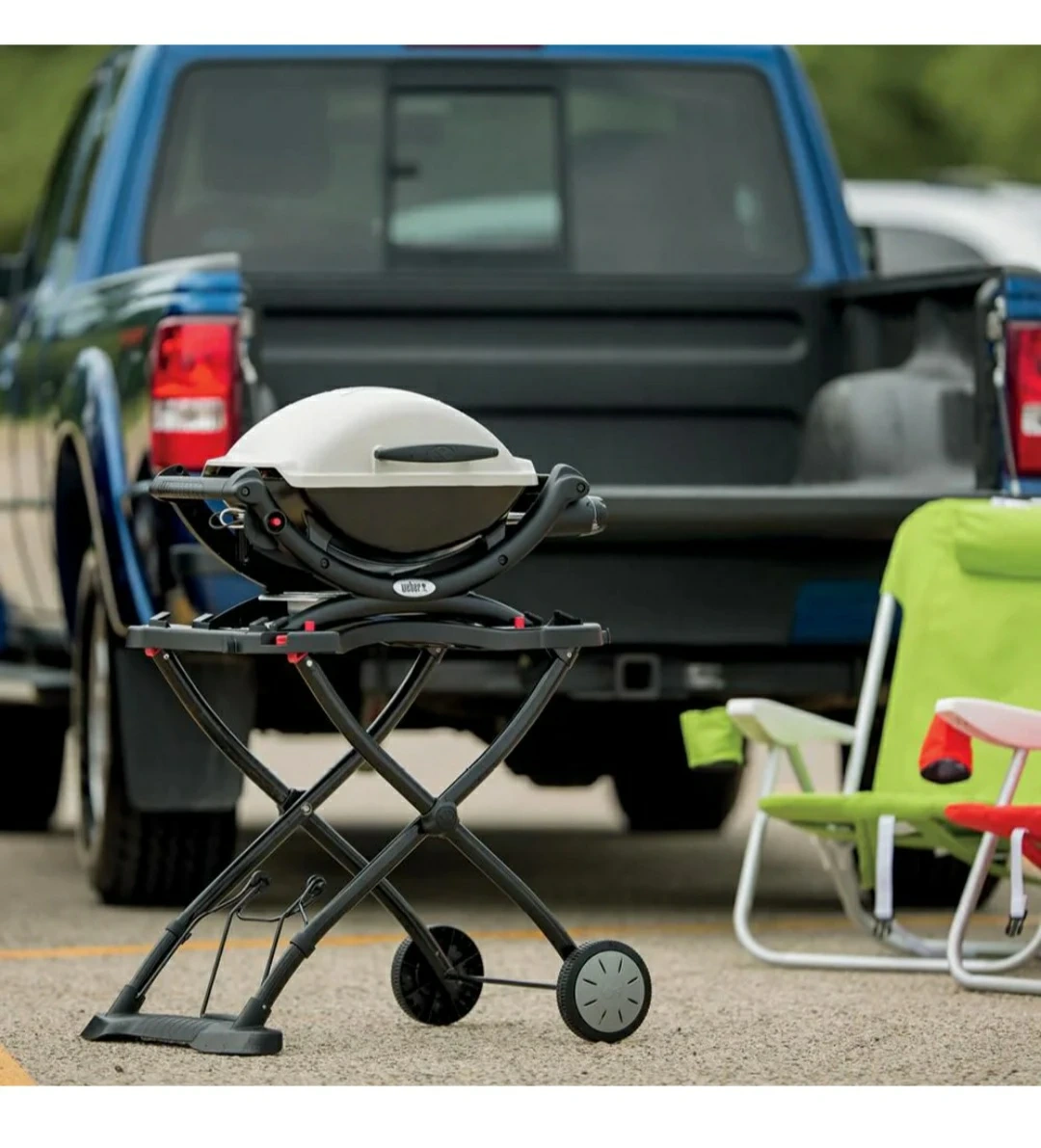 Weber Q Folding BBQ Cart BRAND NEW IN BOX $85 MODEL NUMBER 6557 5 AVAILABLE BRAND NEW IN BOX At home or on the go, rely on the portable Weber Cart. Simply push a button to switch from grilling to transport mode. Built to last with sturdy wheels and built-in utensil hooks, this cart will allow you to g, Little assembly required. Its front-loading design allows you to lock the grill in place. With the push button, you get easy storage and portability and the barbecue remains attached to the cart. Includes two all-weather wheels and two integrated utensil hooks.