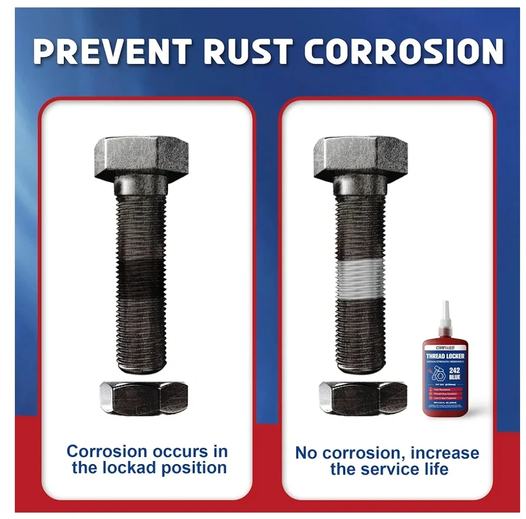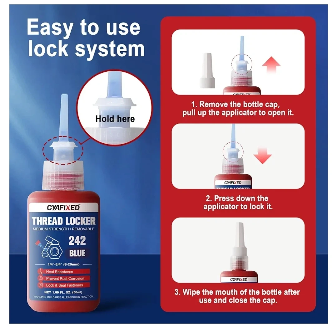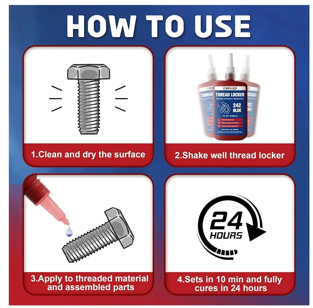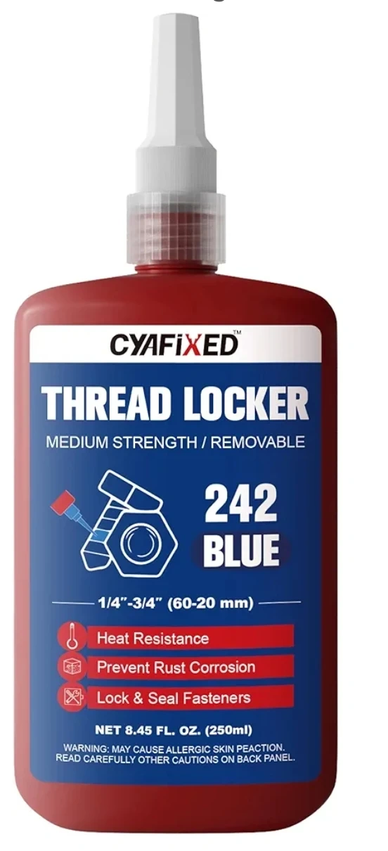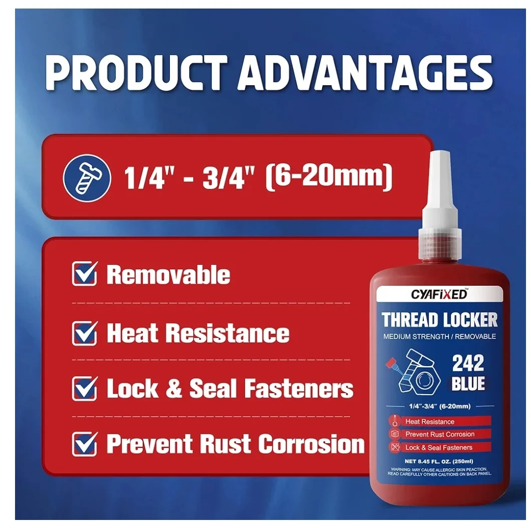 8.45 fl oz (250ml) bottle of CYAFixed 242 Blue threadlocker. Medium strength, removable. Locks and seals fasteners. Heat resistant. Prevents rust and corrosion. Suitable for 1/4"-3/4" (6-20mm) fasteners. Cures in 24 hours.