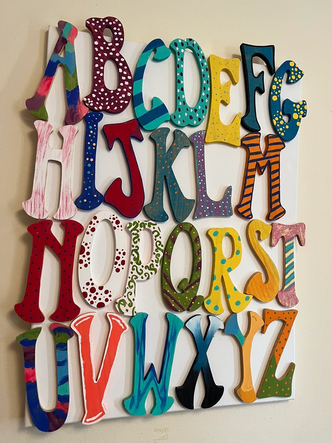 Set of 26 hand-painted wooden letters. Each letter features a unique design and colour. Mounted on a canvas background. Perfect for a child's room or classroom.