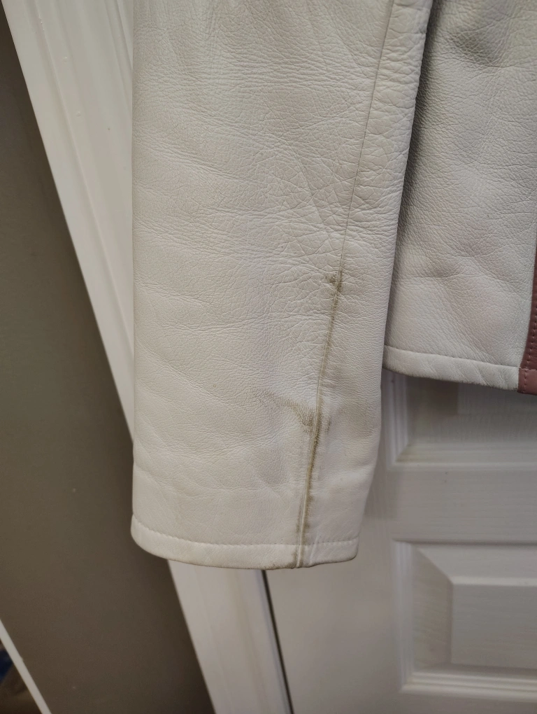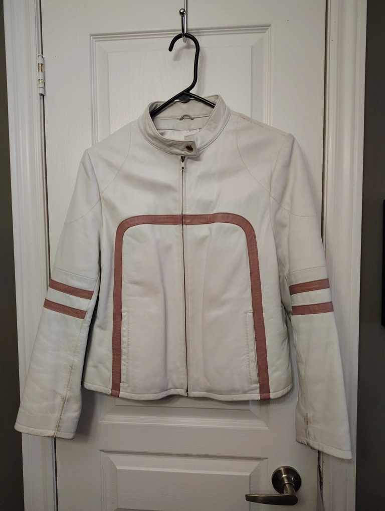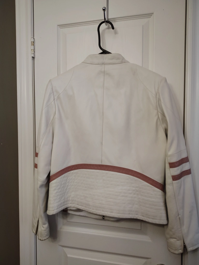 Off-white leather jacket. Features pink accents. Zip-up front. Size large. Needs cleaning Pick up Yonge and Finch Area.