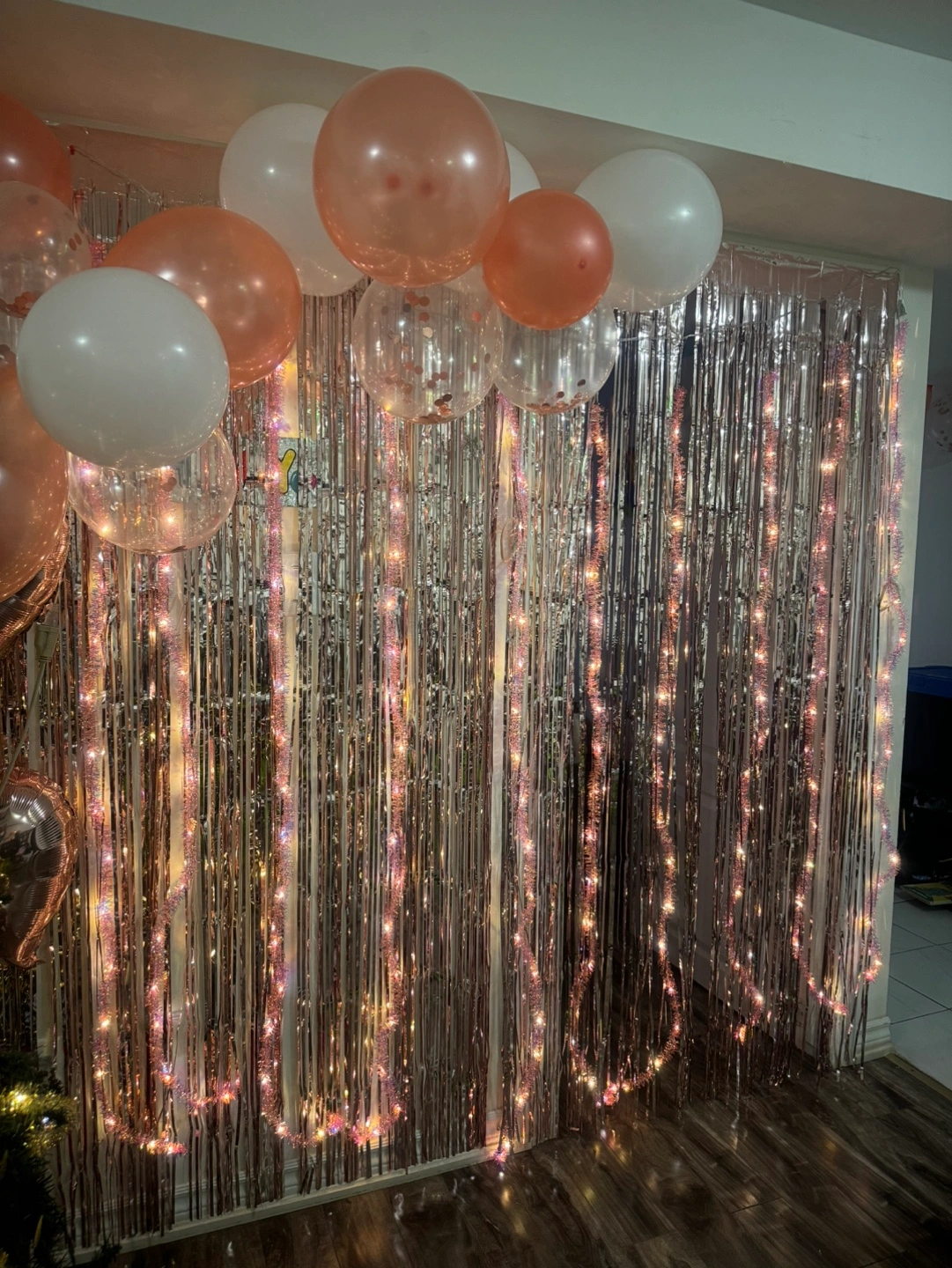 Beautiful rose gold tinsel garlands back drop curtain with integrated fairy lights. Perfect for birthdays, anniversaries, or any special occasion. Brand new packed box in stock