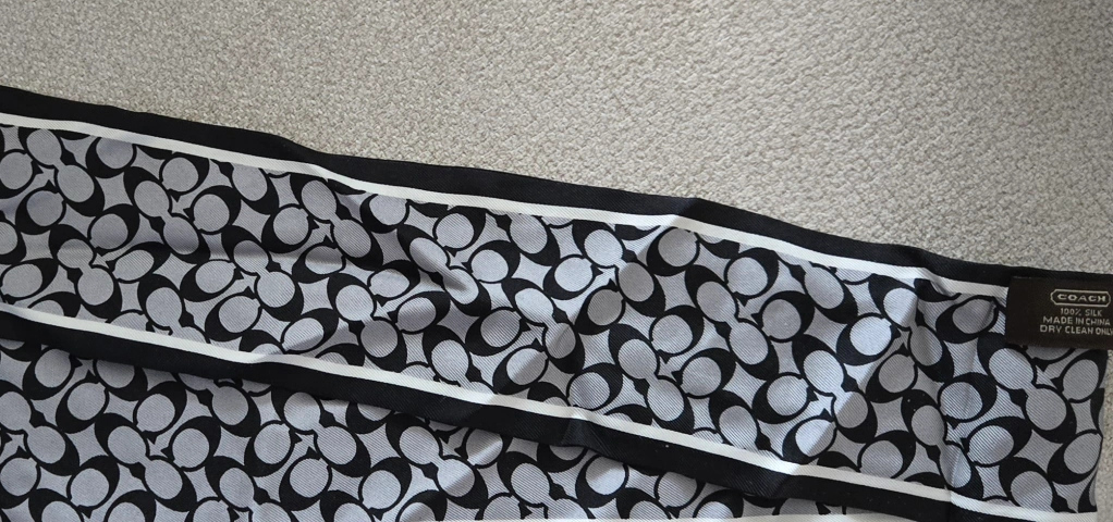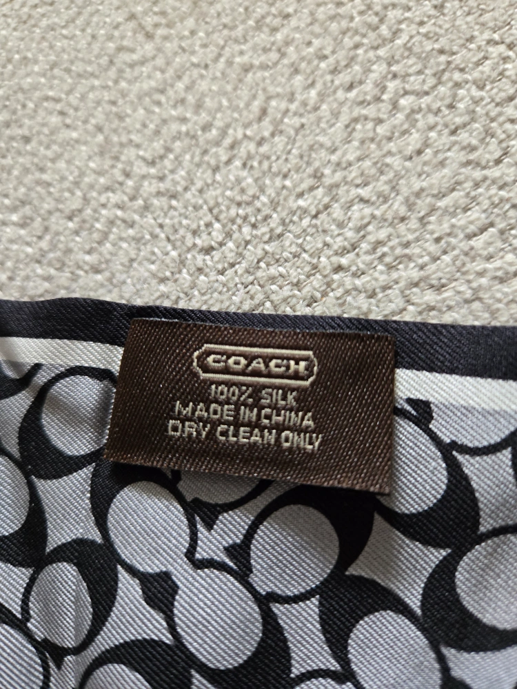 Beautiful silk Coach scarf. Features a repeating logo pattern in black and grey on a silk material both sides. Dry clean only. Retails for $60