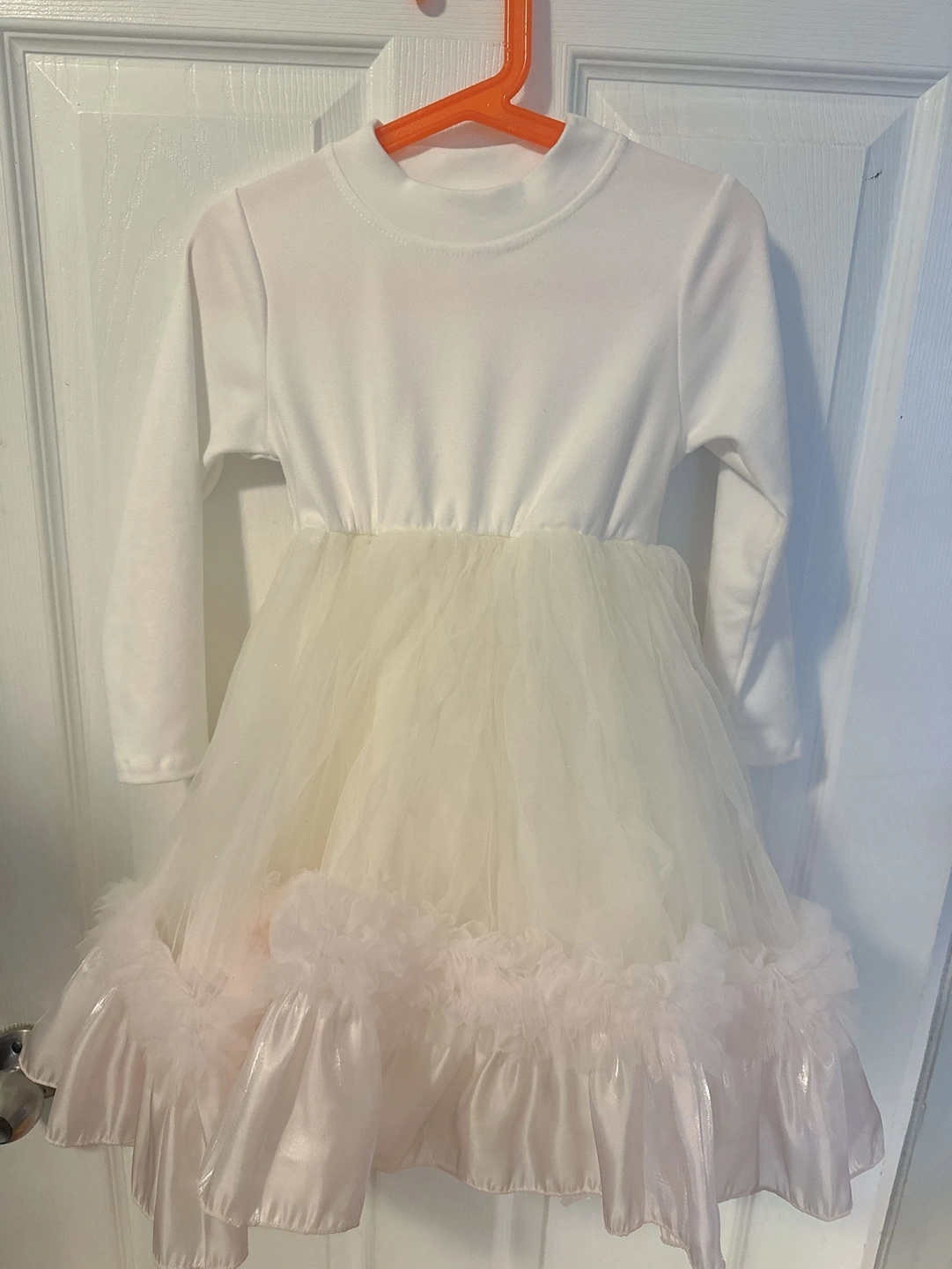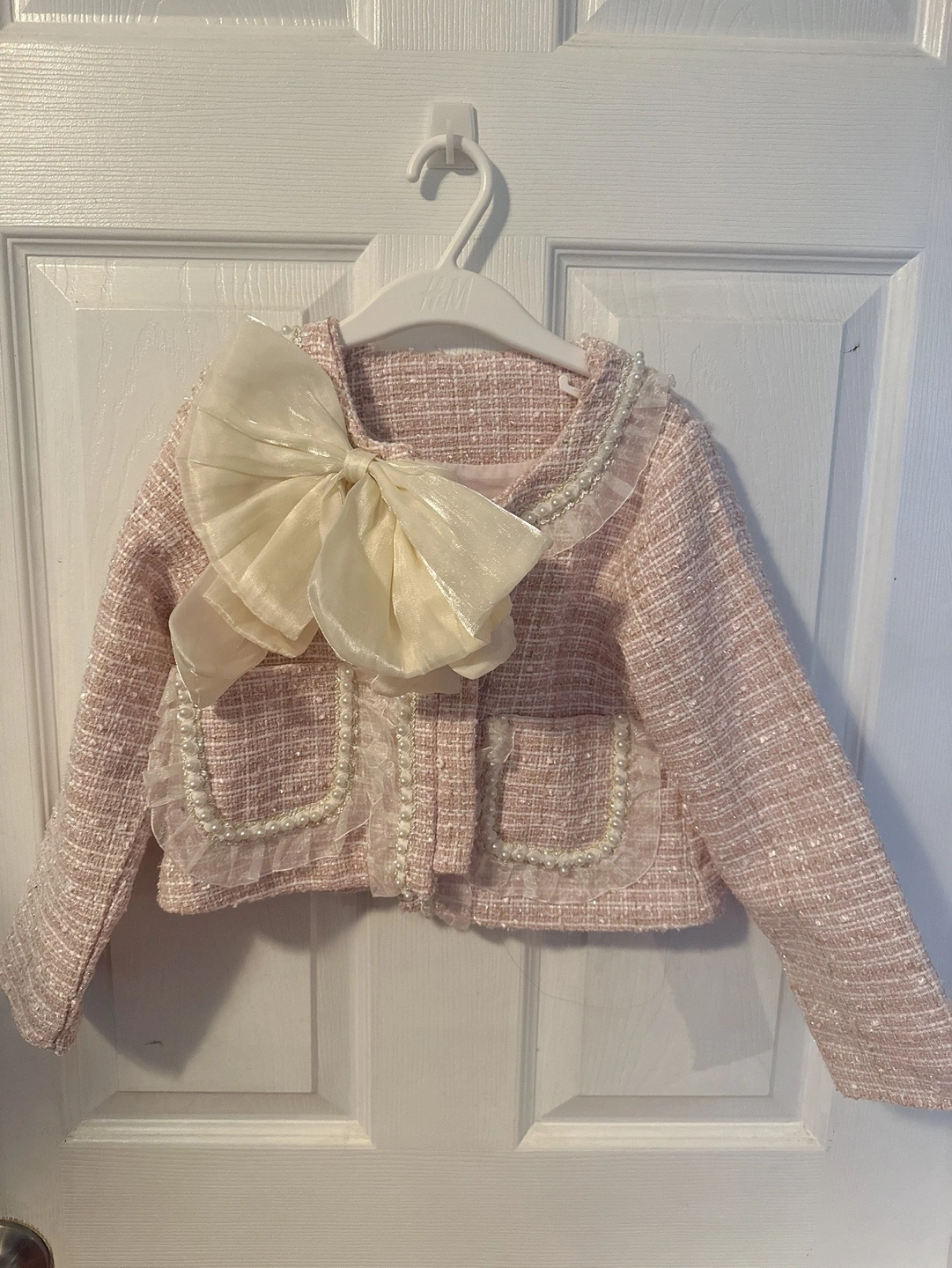 Beautiful girls' outfit, perfect for special occasions. Includes a white long-sleeve tulle dress with a pink ruffled hem and a pink tweed jacket featuring a large cream bow and pearl accents. Size 4-5T