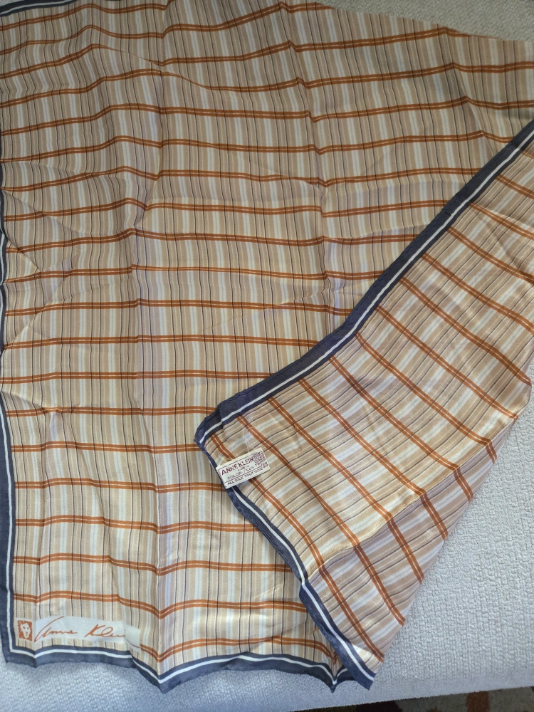 Vintage silk scarf. Beige and brown plaid pattern. Dark grey border. Excellent condition.