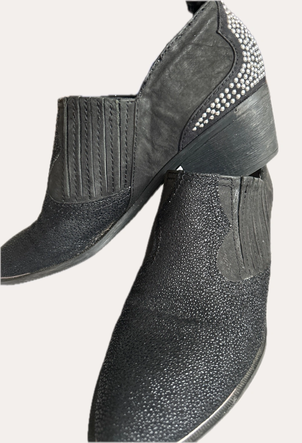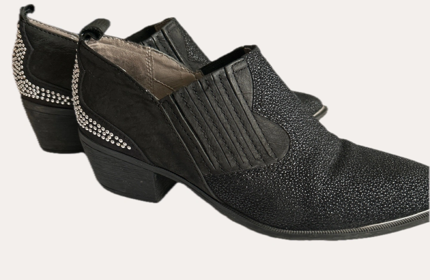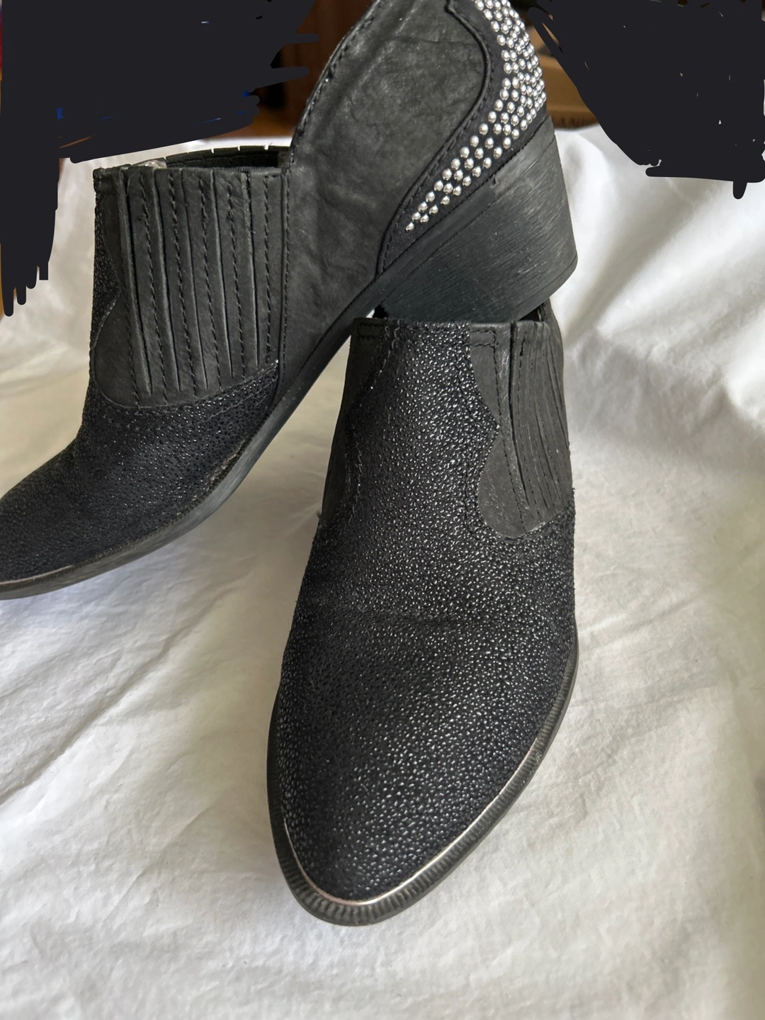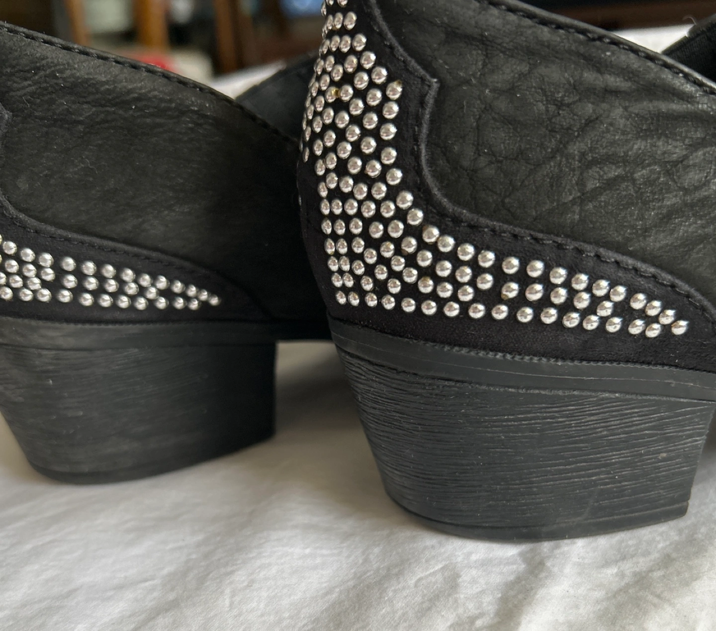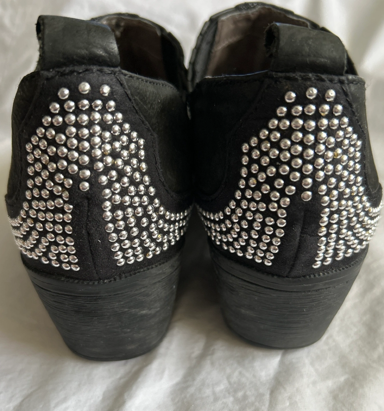 Sam Edelman Black leather ankle boots. Silver-toned stud detailing. Low block heel. Pointed toe. Slip-on style. Used but in excellent condition. Smoke and Pet free home Cash and pick up only please.
