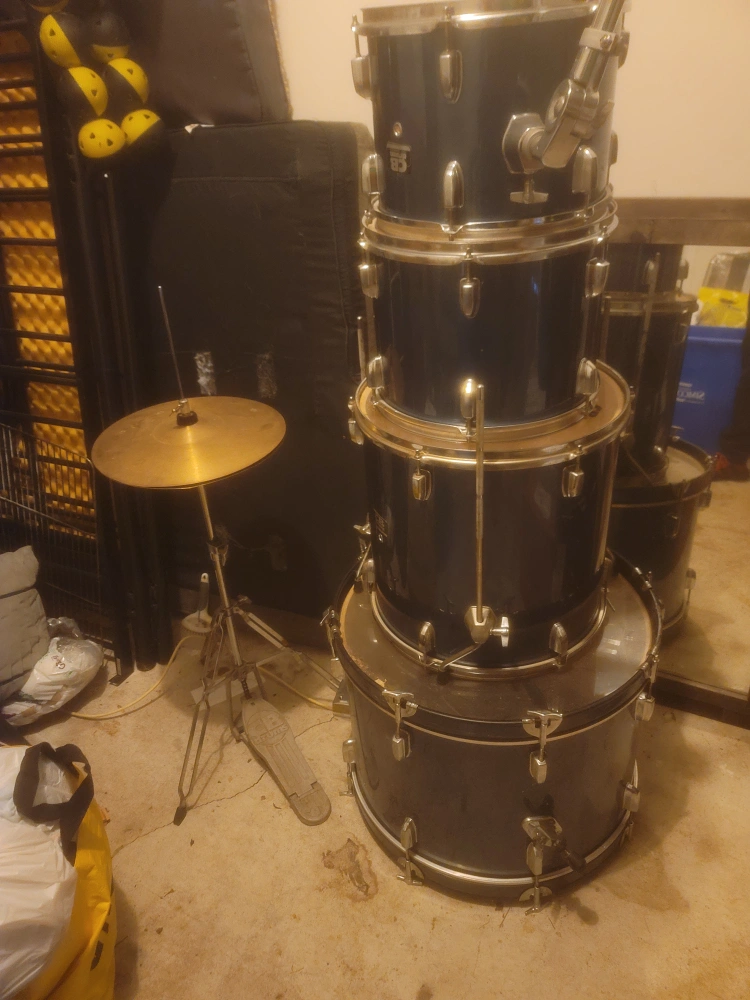 Used drum kit. Four-piece set. Includes bass drum, toms, and cymbal. Some wear and tear. Good for practice or beginners.