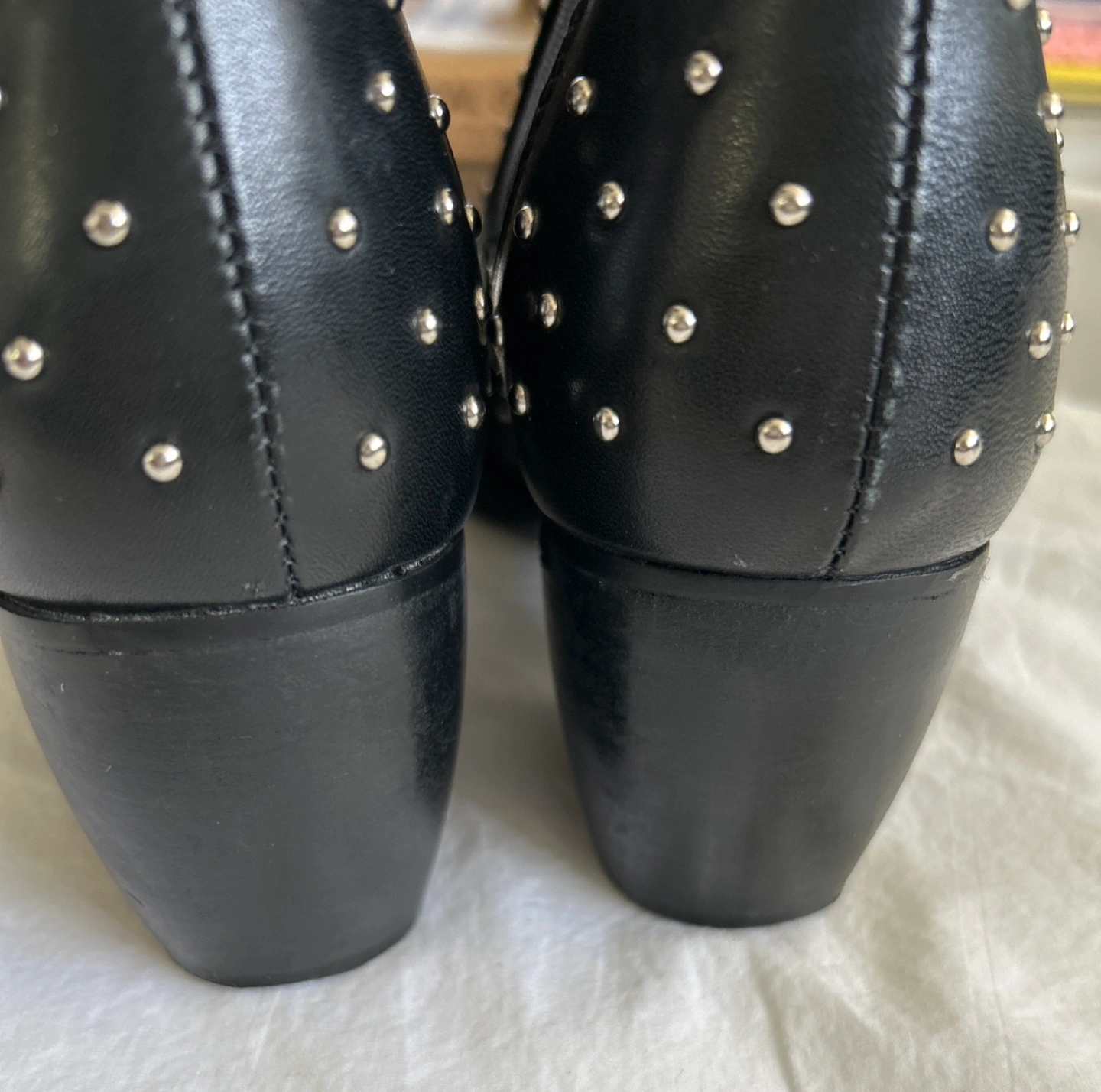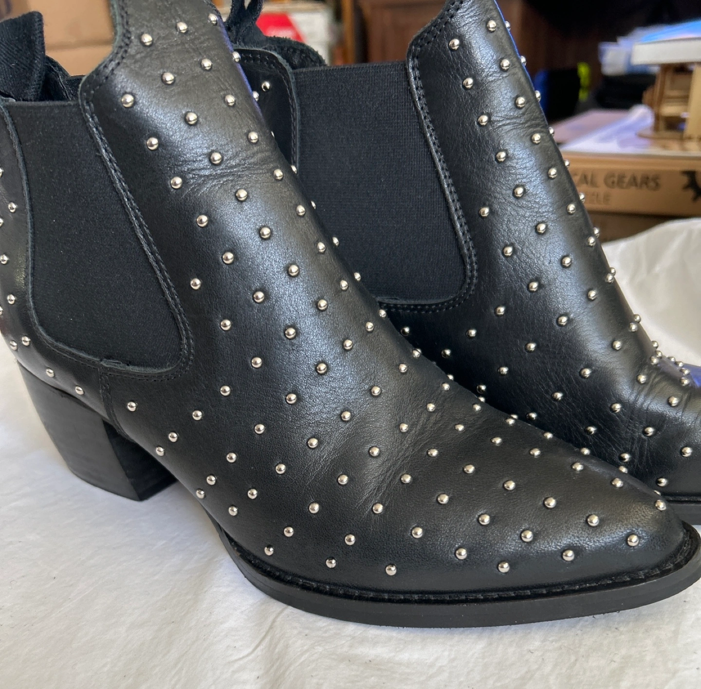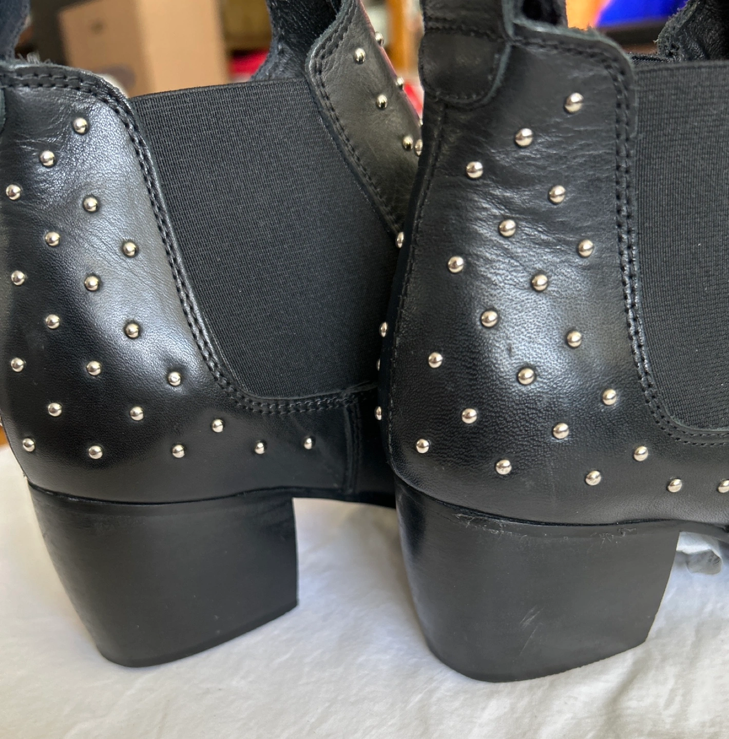 Black leather ankle boots. Studded detail. Pointed toe. Block heel. Made in Portugal. Clean and in excellent condition. Good quality shoes. Smoke/Pet free home. Cash and Pick up only please.