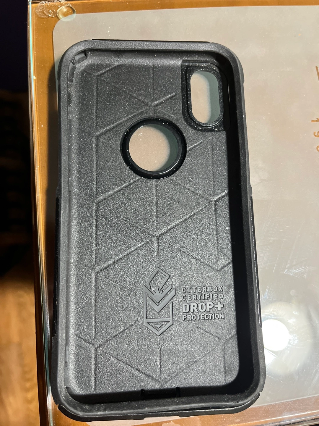 Black OtterBox case for iPhone X. Drop+ protection. Pre-owned, shows minor wear.