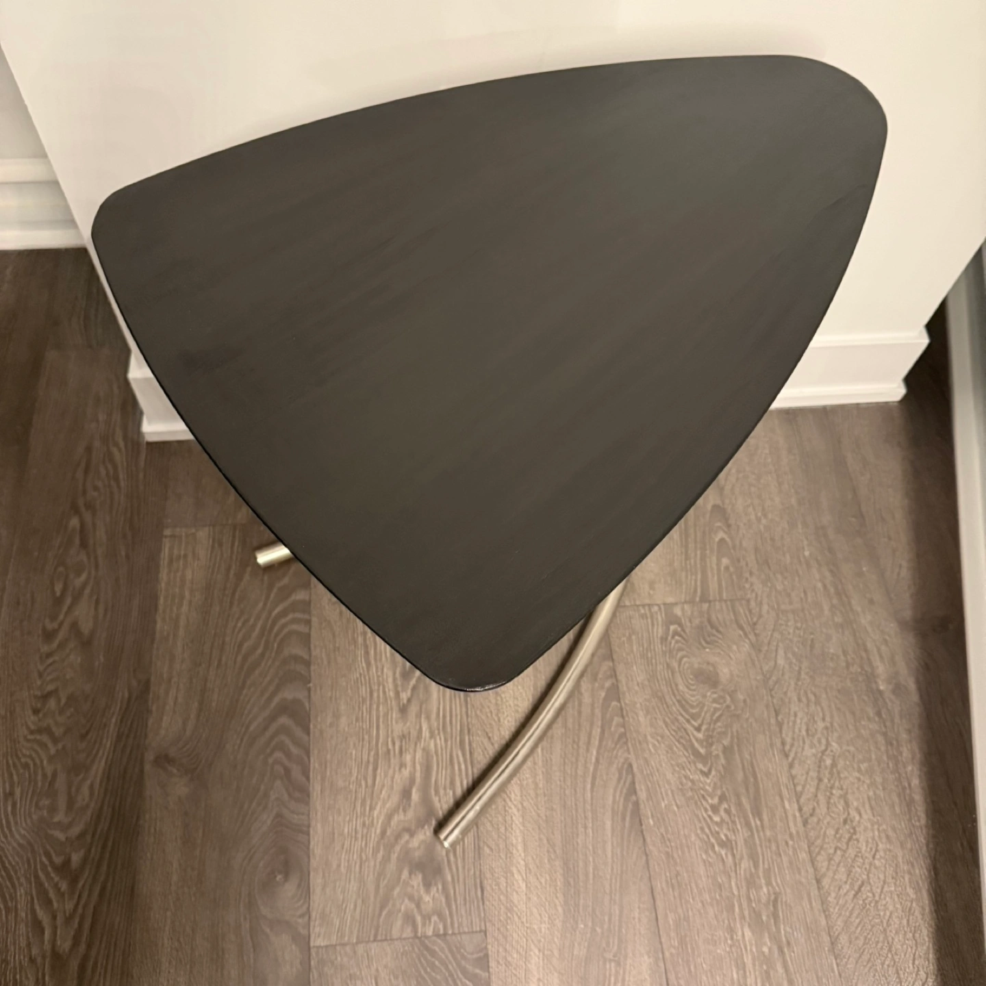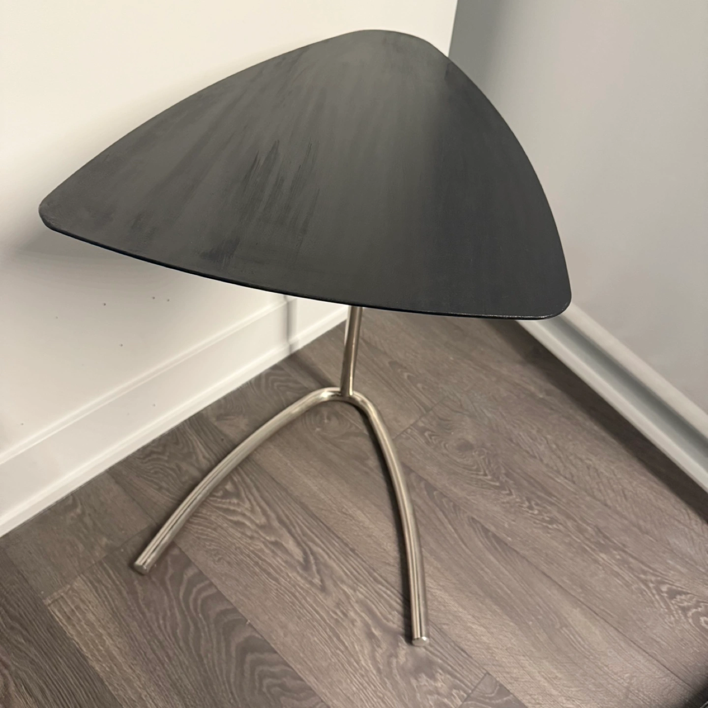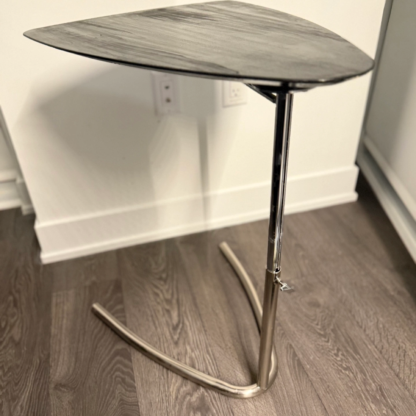 Unique triangular top. Chrome-finish metal base (17.5x23.5). Adjustable height 16.5-28”. Perfect for small spaces. *please read before reaching out* - price is fixed. Reach out only if interested. - item is first pay first serve. - pick up 5 min walk from Yonge and Bloor Station (Charles/Yonge)