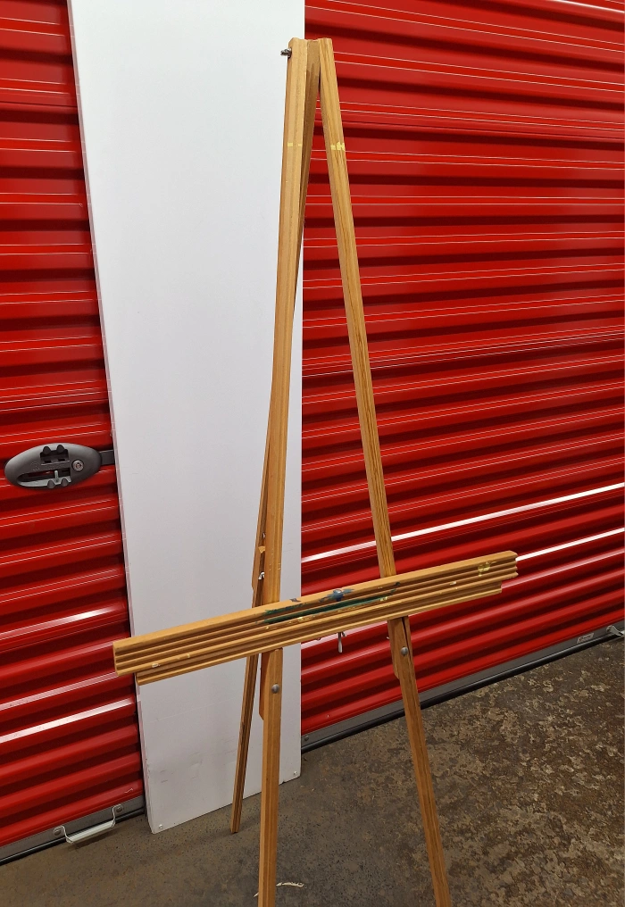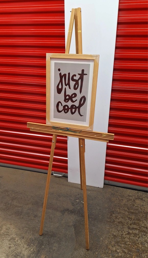 Simple wooden easel, light brown colour. Folds down compact for transport to art class or storage. Minor paint splatters from use. Split in wood, shown in photos. Nice for displaying artwork or photos. Framed "Just Be Cool" print is for display purposes only, available for sale separately ($3). Proceeds to cat rescue, Kit Cat Club Of Hamilton Upper Wentworth and Queensdale area Hamilton mountain Currently in storage downtown, could meet around there