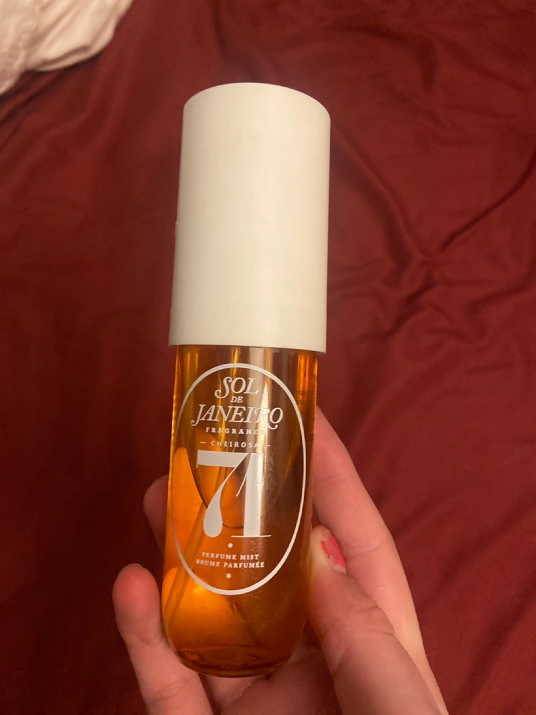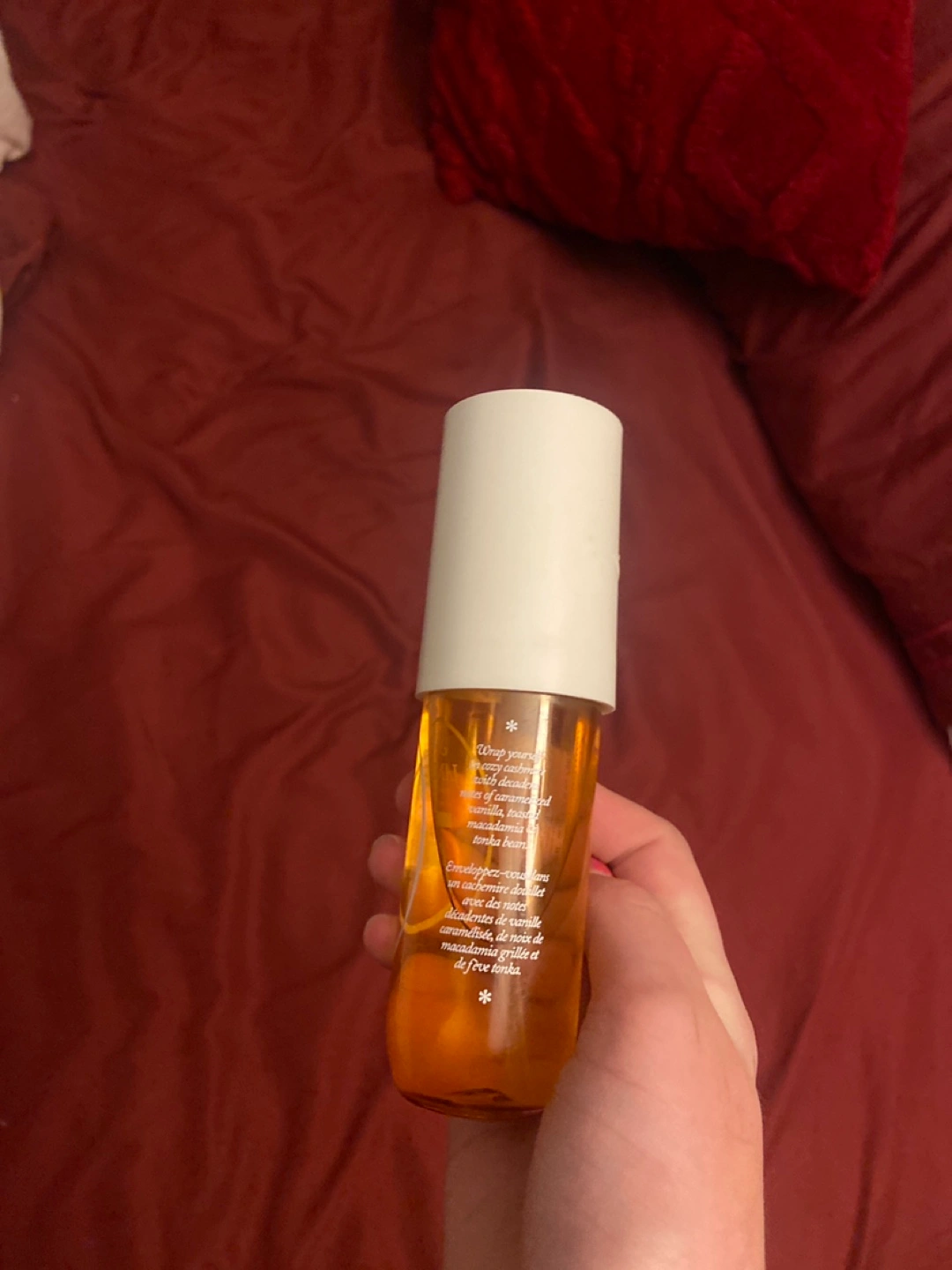 Small perfume mist. Amber coloured bottle, white cap. Used once or twice