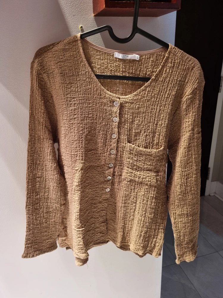 Long-sleeved top with buttons. Brown/beige colour. Features a cute pocket. Lightweight crinkle effect material. Images are taken in both types of lighting to show color in the most realistic way possible ๐