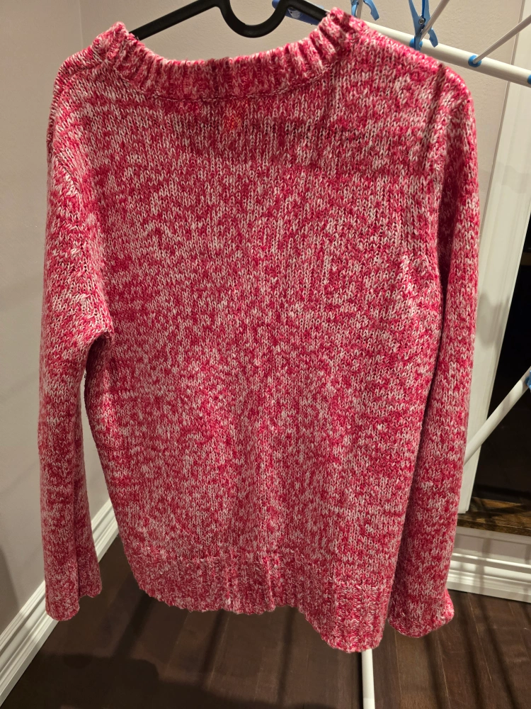 Women's long-sleeved sweater. Pink and white knit. Relaxed fit. Crew neck.