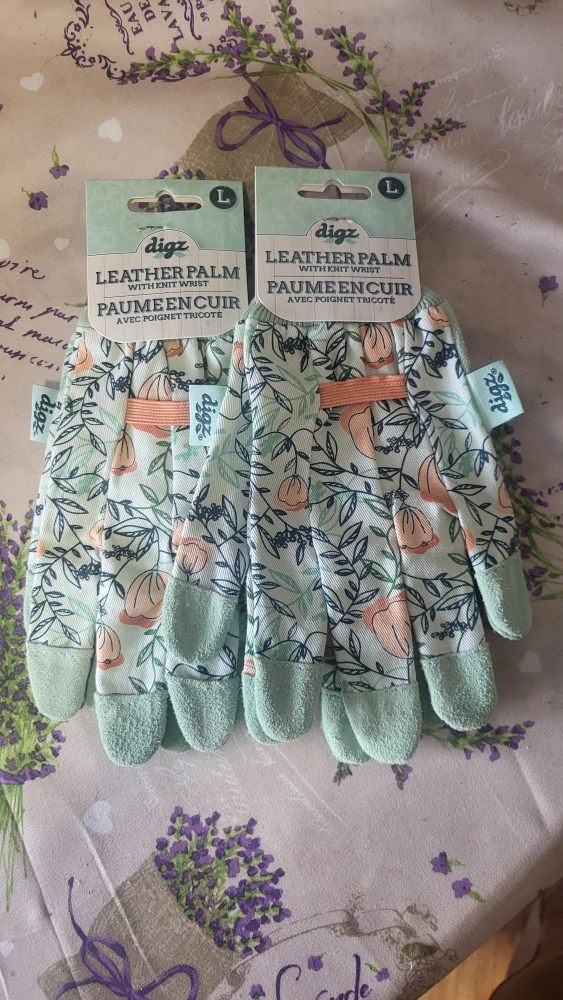 Pair of Digz brand gardening gloves. Leather palm, knit wrist. Mint green floral print. Size large. have 2 pairs. can do a deal for both.