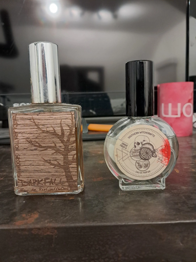 Darkfall Eau de Parfum in a rectangular bottle, Southern Witchcrafts Grave Fruit Eau de Parfum in a round bottle. Darkfall is 80%, grave fruits is free with purchase.