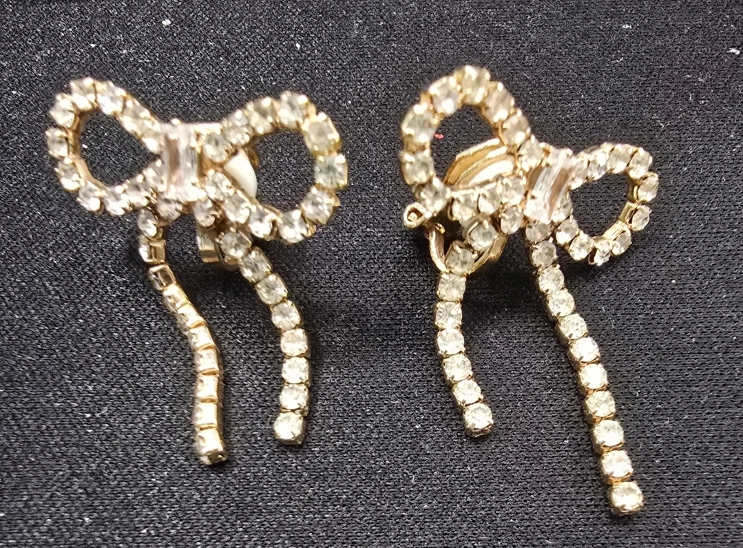 Pretty pair of clip-on earrings. Gold-tone metal setting. Clear rhinestones form a bow shape with dangling accents. Elegant and sparkly. Price negotiable & open to trades. Delivery possible to most line 1 and line 2 stations.