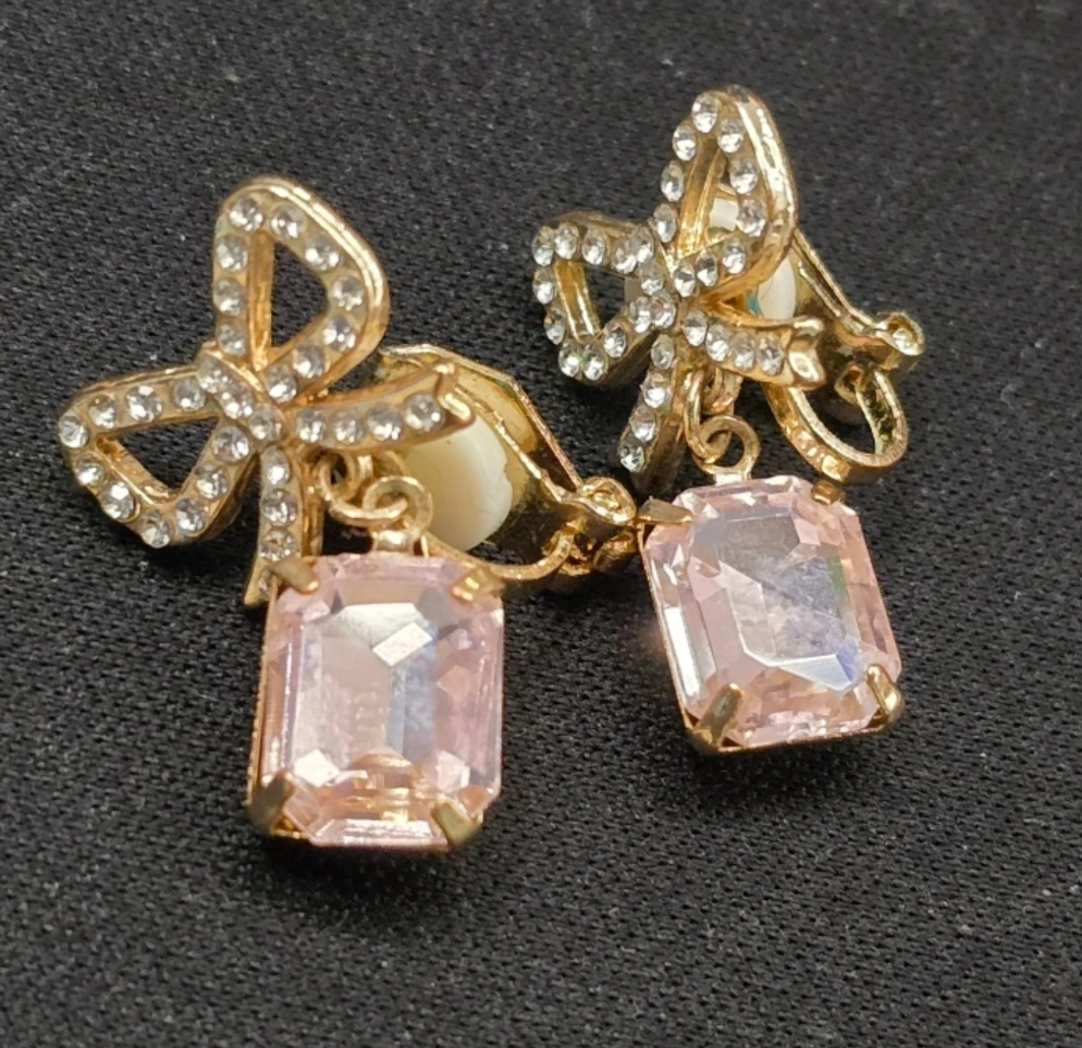 Gold-tone clip-on earrings. Features pink square crystals and sparkly bows. Elegant and eye-catching. Price negotiable & open to trades. Delivery possible to most line 1 and line 2 stations.