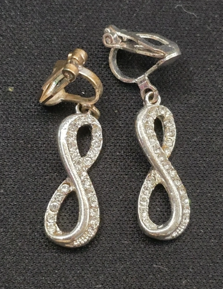 Pair of silver-toned dangling clip-on earrings. Infinity design. Features clear crystals. Elegant style. Price negotiable & open to trades. Delivery possible to most line 1 and line 2 stations.