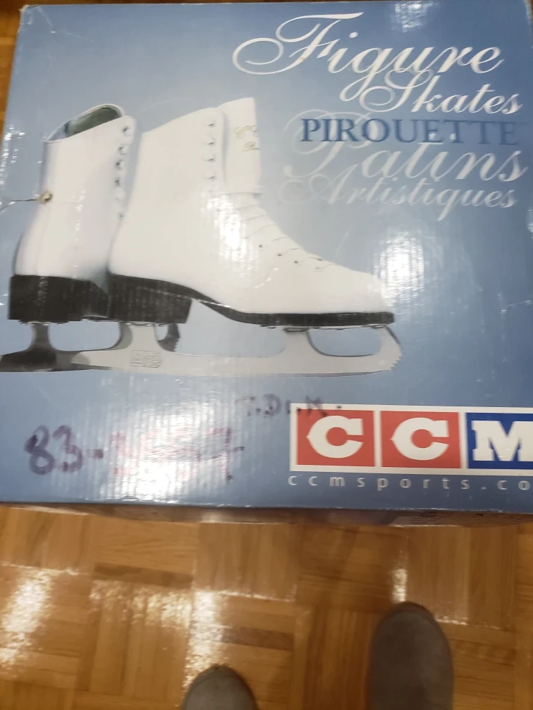 White leather figure skates. Almost New in box. Includes original warranty card. Size 7