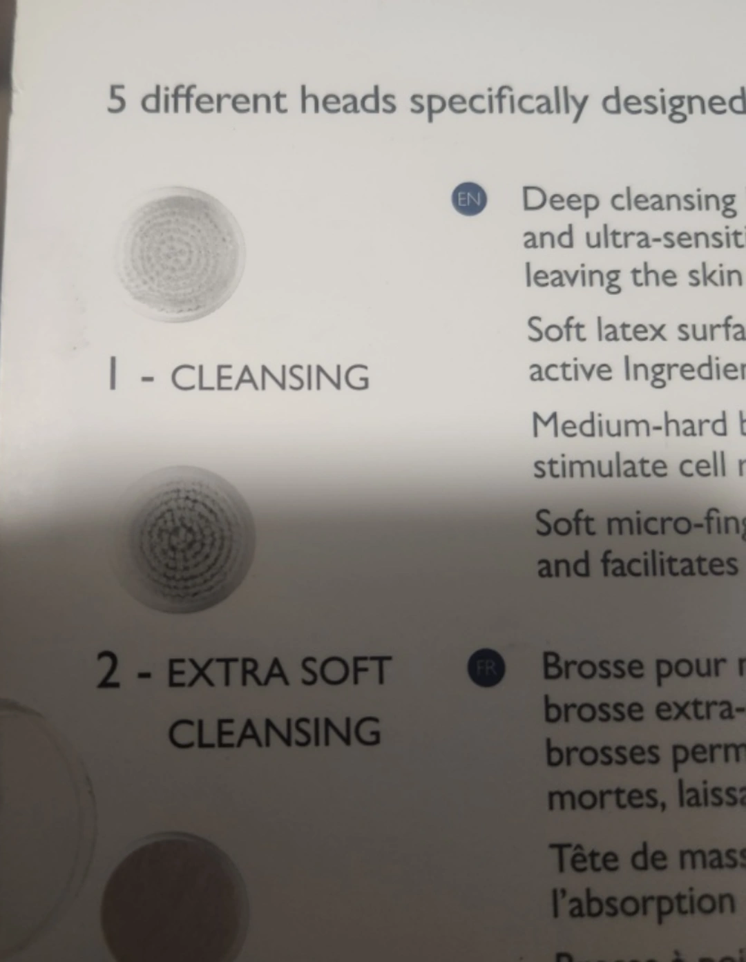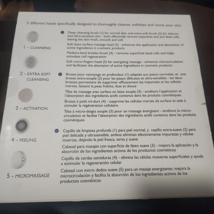 Five interchangeable brush heads. Deep cleanses, exfoliates, and revives skin. Includes cleansing, extra soft cleansing, activation, peeling, and micromassage heads. Excellent condition, used once or twice, as I have another skin cleansing kit.