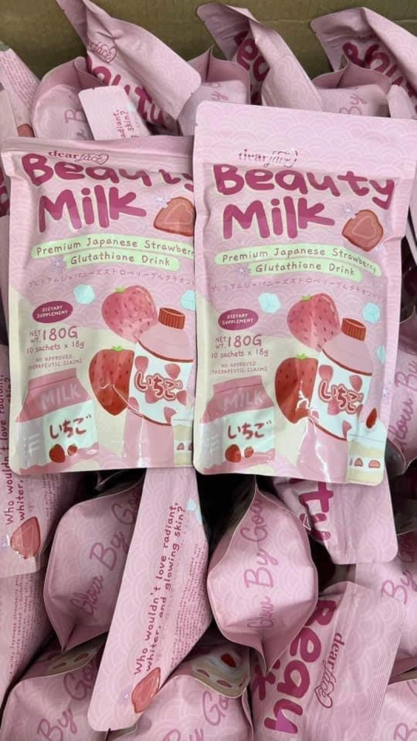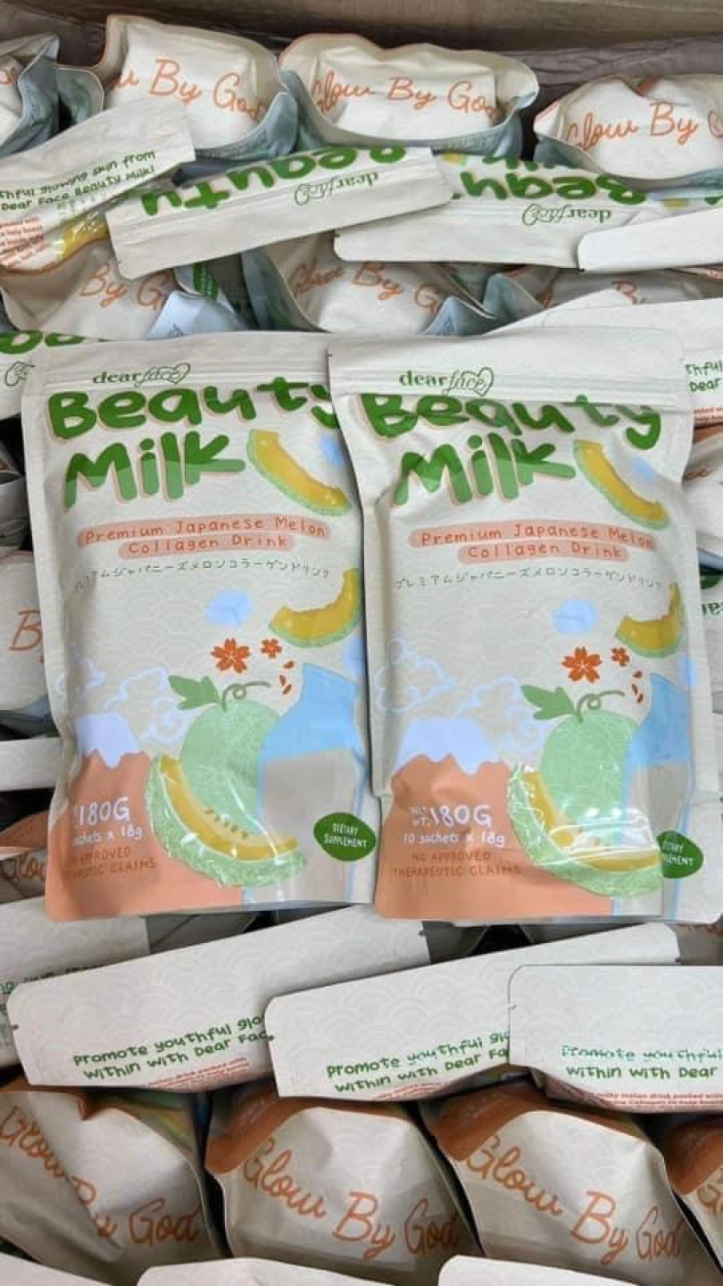 Dear Face Beauty Milk sachets. Various flavours available including Lychee, Strawberry and Melon. Premium Japanese drink. 10 sachets per bag.