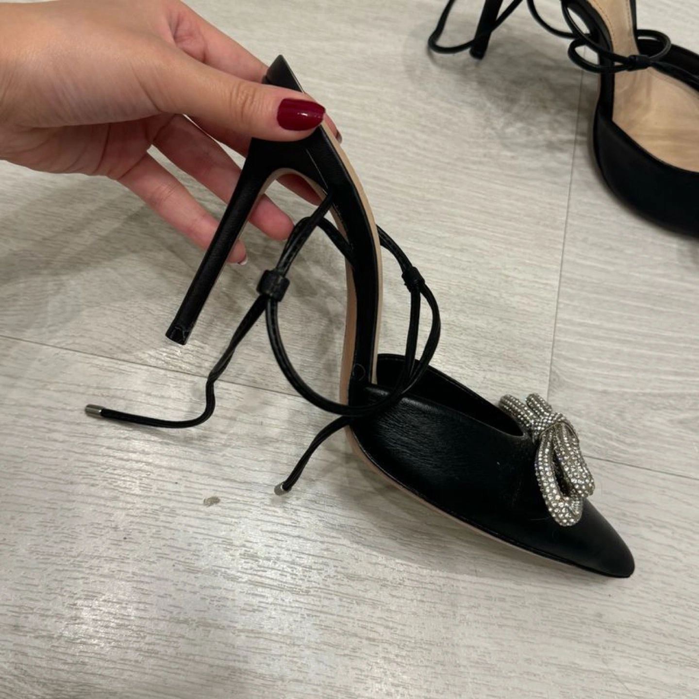 Beautiful black Schutz heels. Pointed toe, stiletto heel, and crystal bow detail. Lace-up ankle closure. Size 36 or women 7 Used once Like new Real Leather Brand Schutz