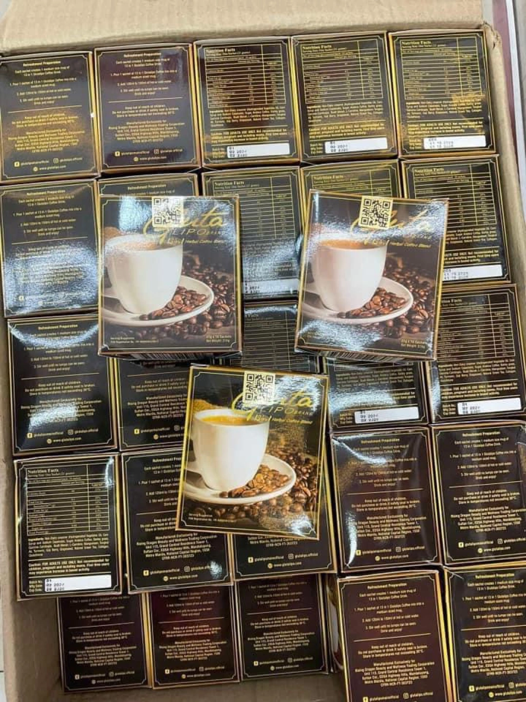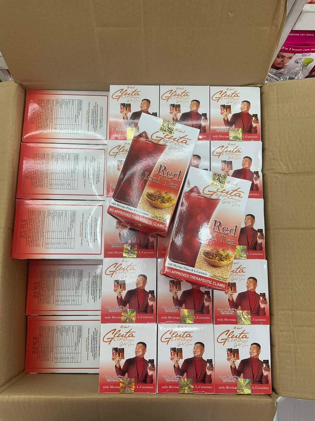 Gluta Lipo Coffee and Red Iced Tea and lemon flavor. Perfect for resale. Individual boxes show nutritional information and preparation instructions.