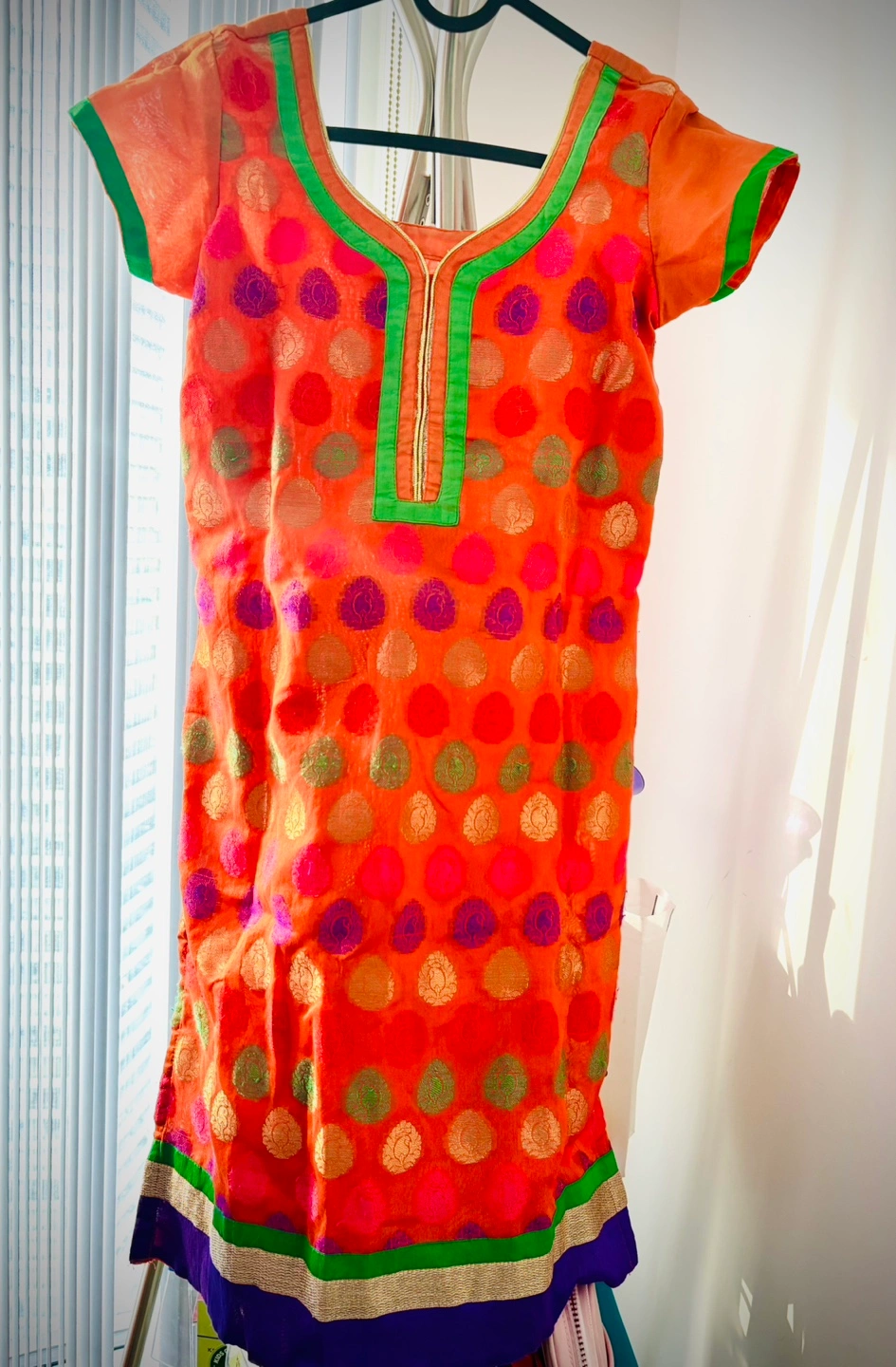 Gorgeous orange Punjabi suit. Short sleeves. Multicoloured embroidered details. Great for special occasions. Ready to wear.