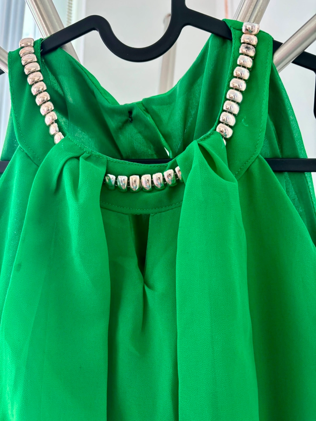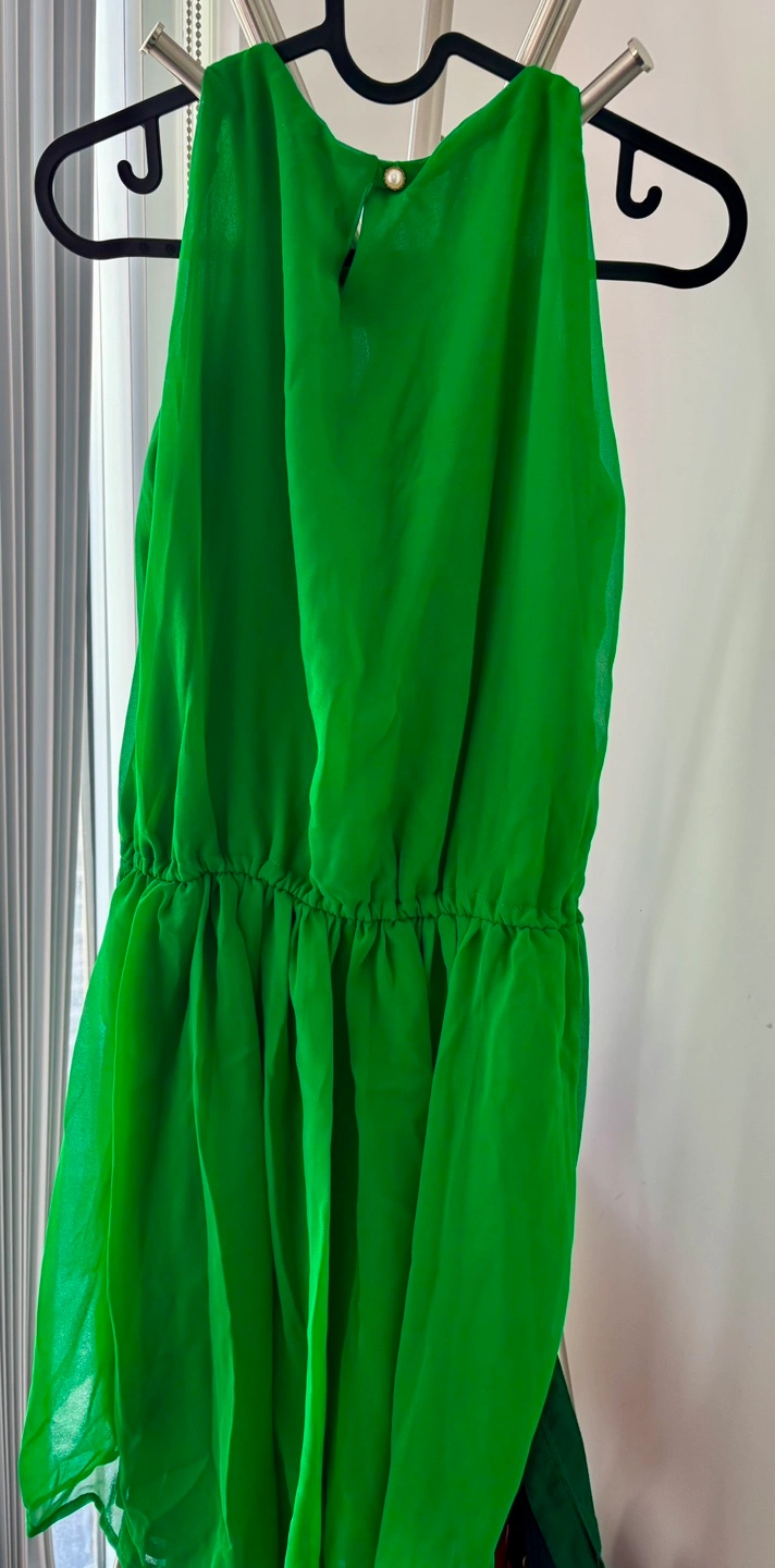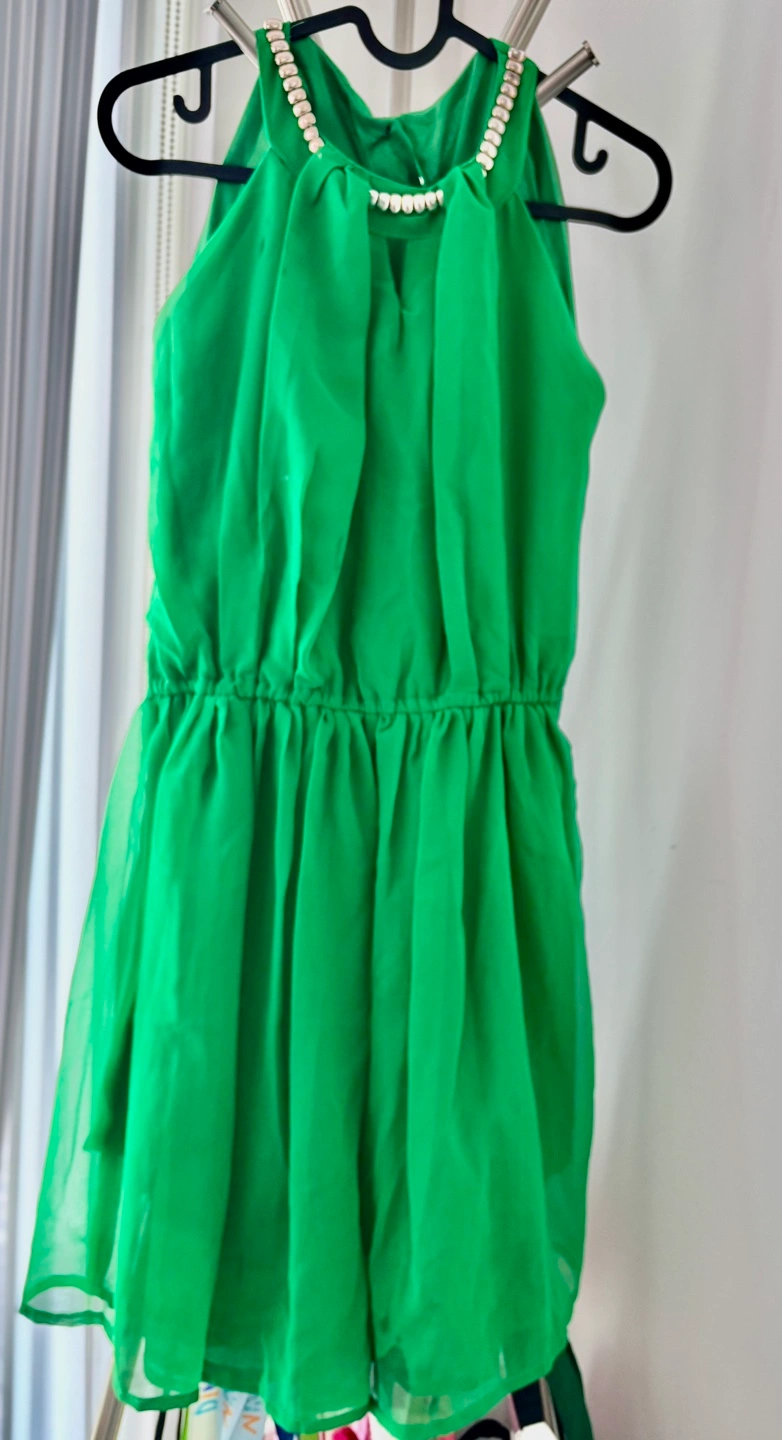 Beautiful emerald green mini dress. -Halter neck style with decorative golden embellishments. -Flowy chiffon fabric. -Elastic waist.