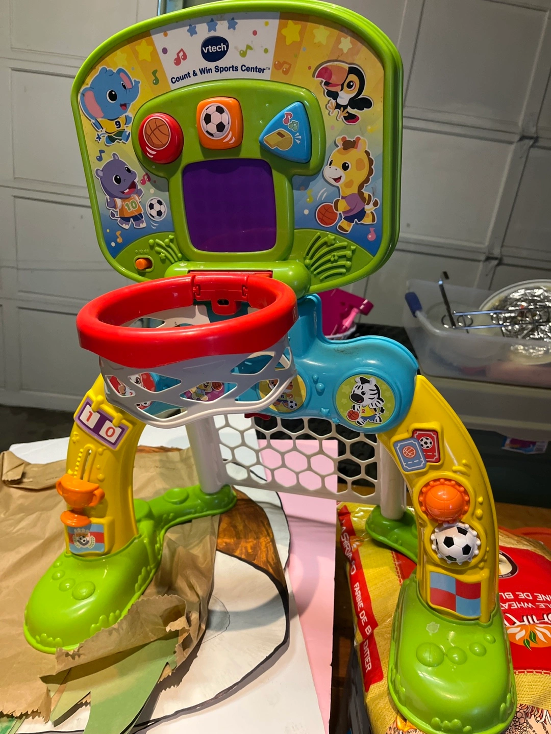 Interactive toy, basketball hoop and soccer goal. Features light and sound effects. For toddlers.
