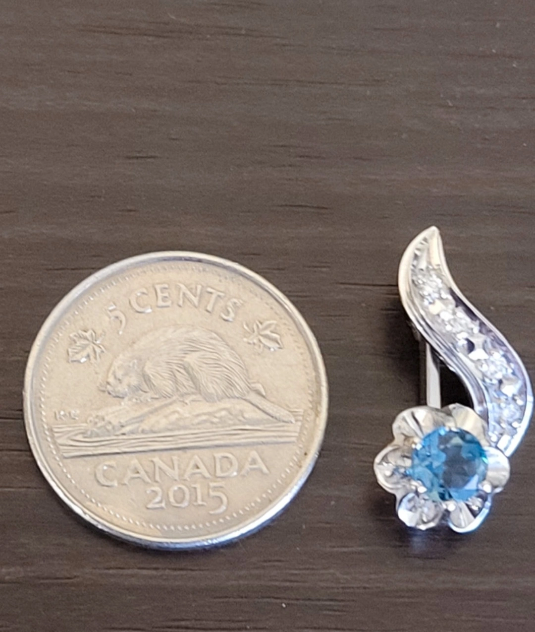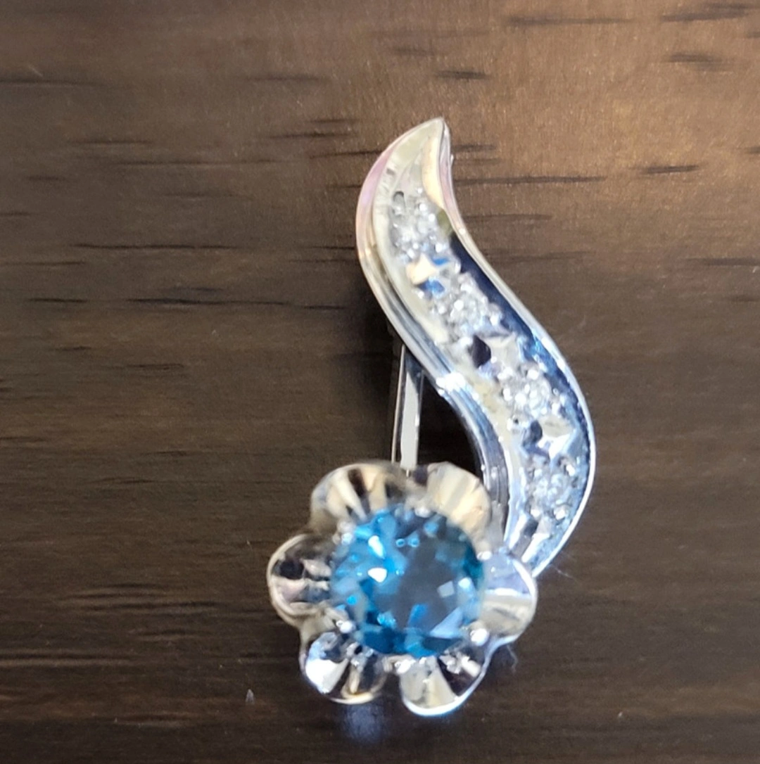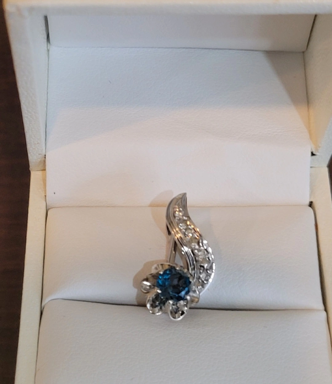 White gold 14 K lovely pendant features a central blue topaz gemstone. Surrounding with real diamonds. Set in white gold 14K. Weighs 2.87 grams.