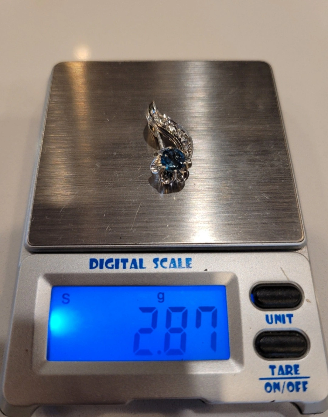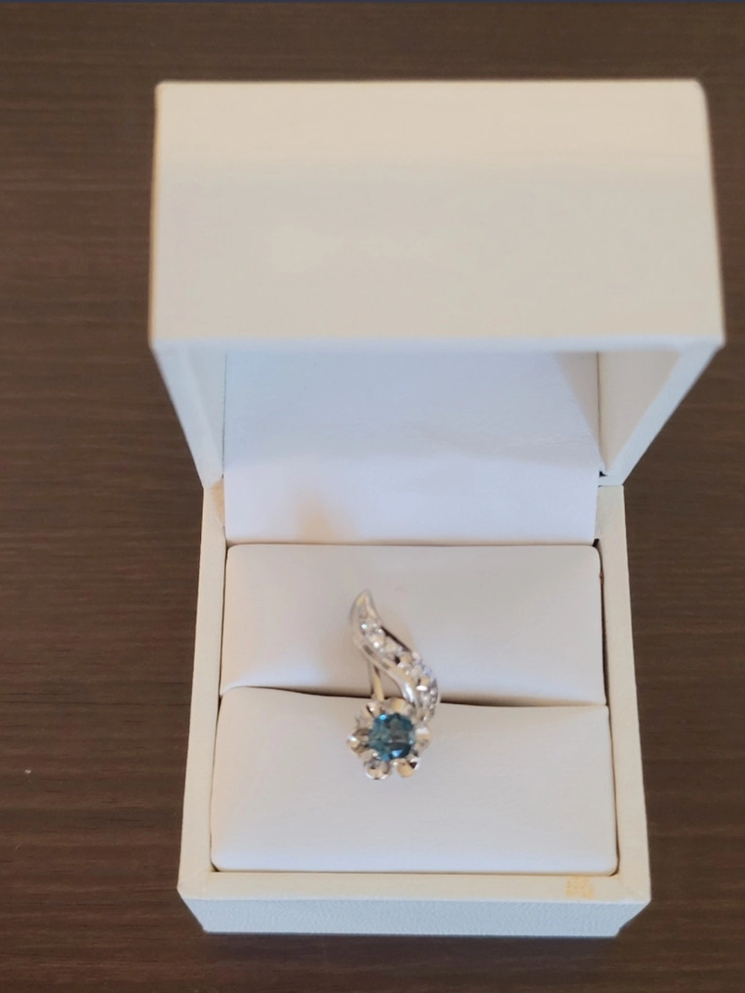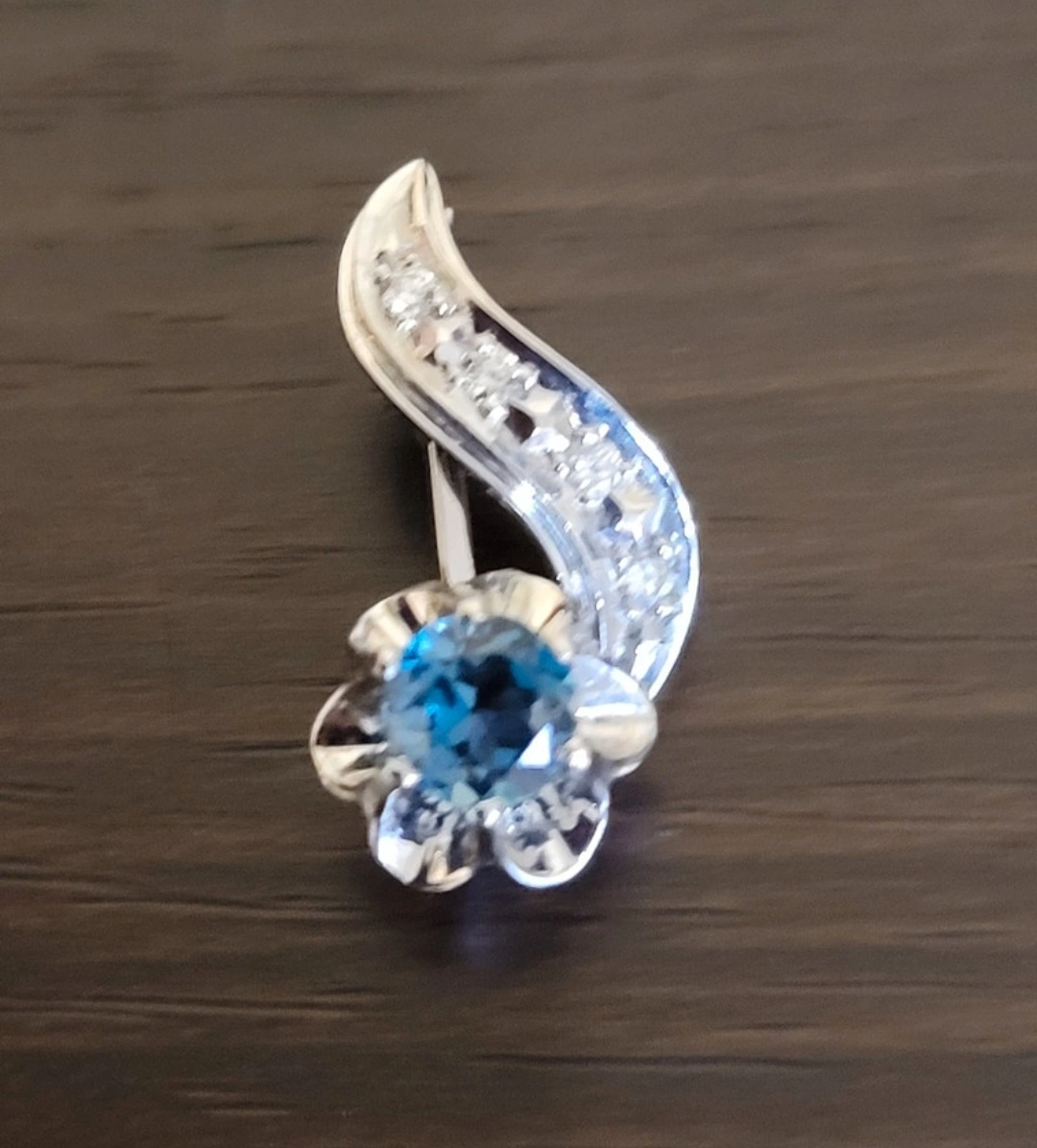 White gold 14 K lovely pendant features a central blue topaz gemstone. Surrounding with real diamonds. Set in white gold 14K. Weighs 2.87 grams.
