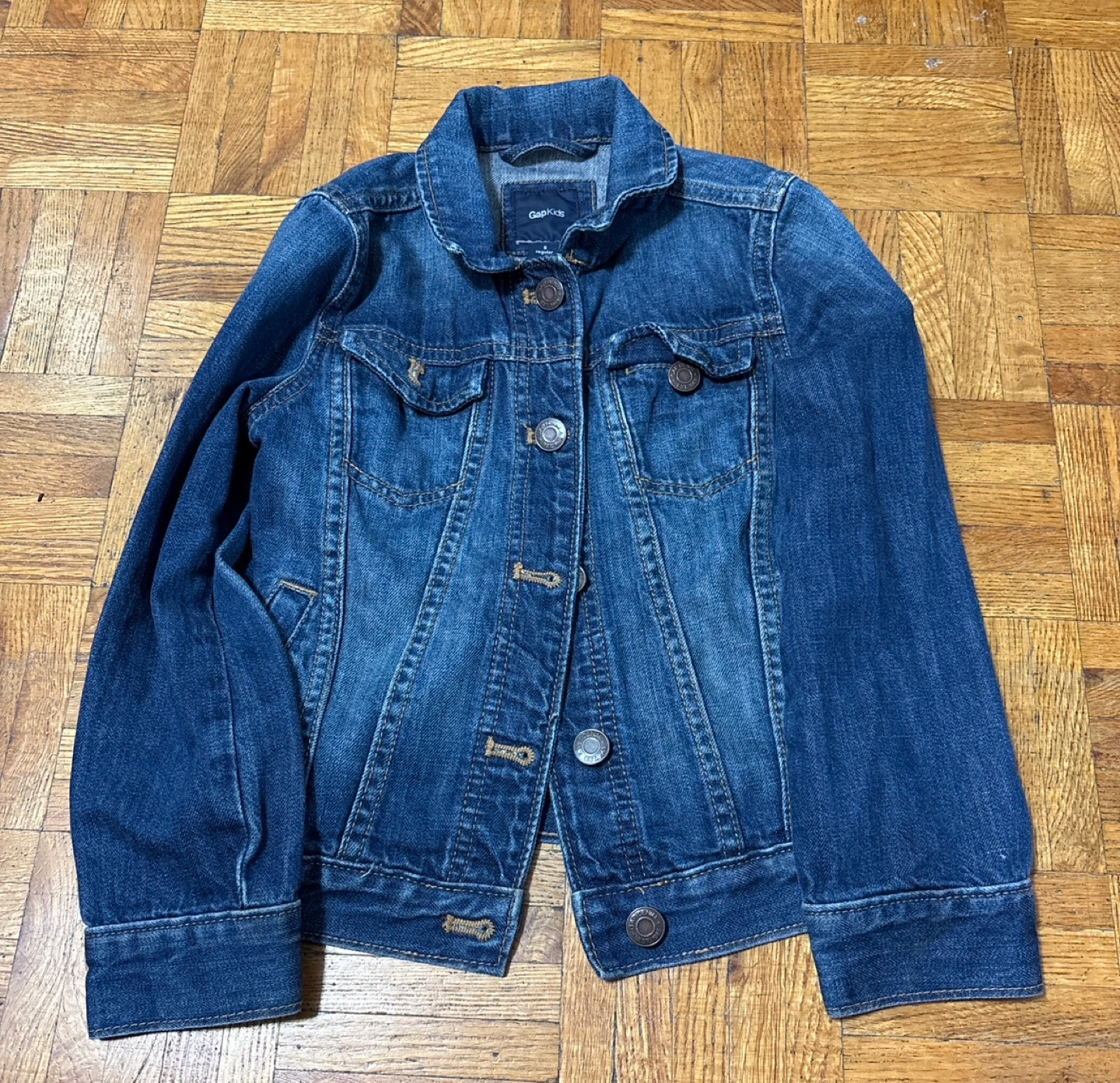 Pick up only Girls' dark wash denim jacket. Classic style, long sleeves, button closure. Two front pockets.