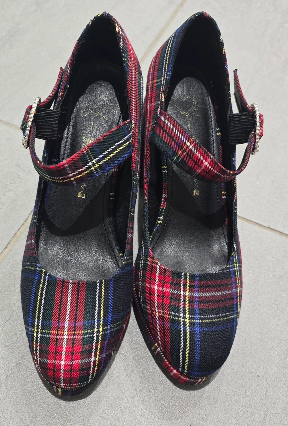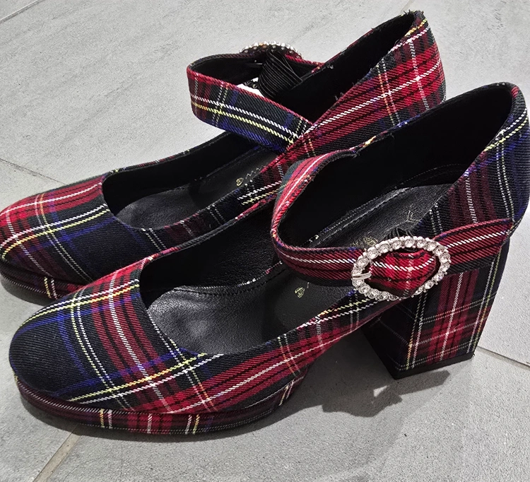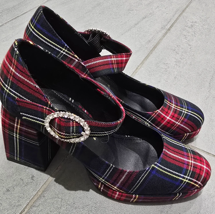 Women's platform heels. Red, black, blue and yellow plaid fabric. Chunky block heel. Mary Jane style strap with rhinestone buckle. Size 39. Wore it once, but it was too big. There's some leftover adhesive from heel pads that I took off inside the back of the shoe but it can be cleaned off. 10$ or trade! Delivery possible to most line 1 and line 2 stations.