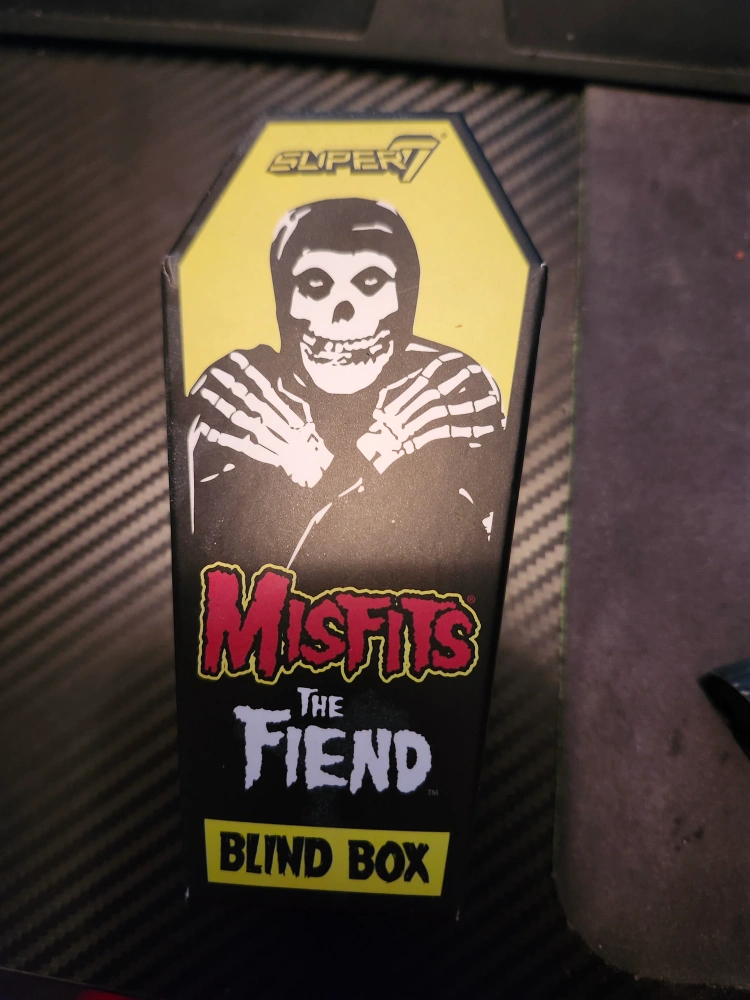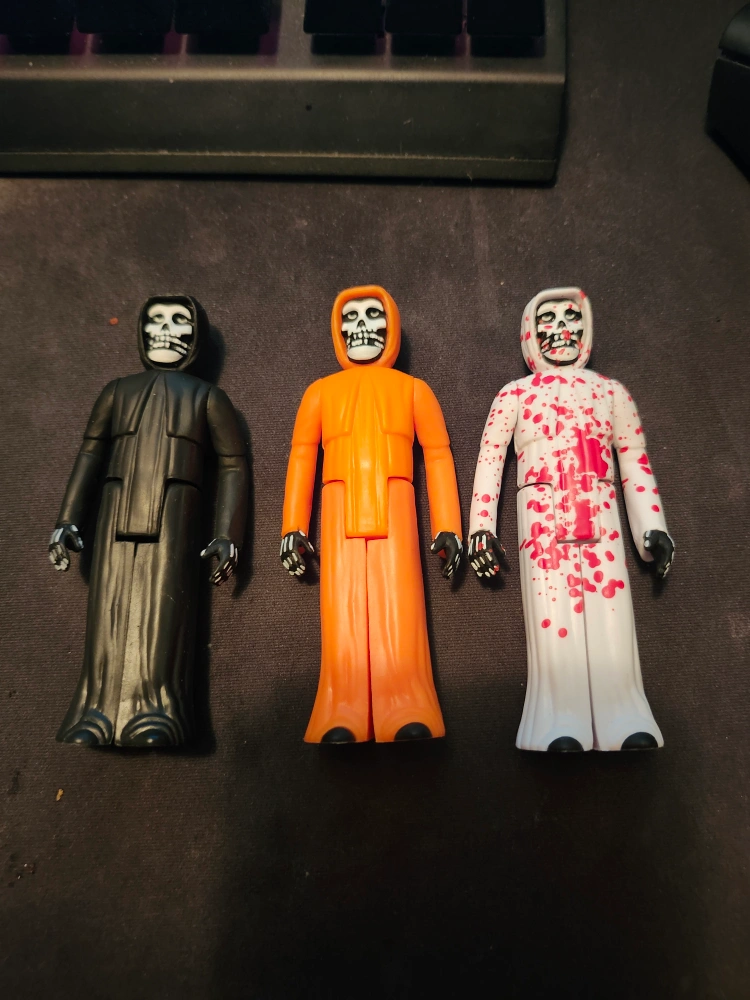 Three Misfits Fiend figures. Black, orange, and bloody variants. Blind box figures. Collectible.