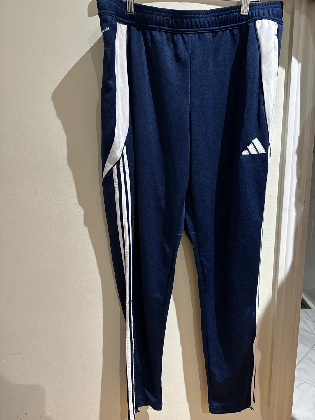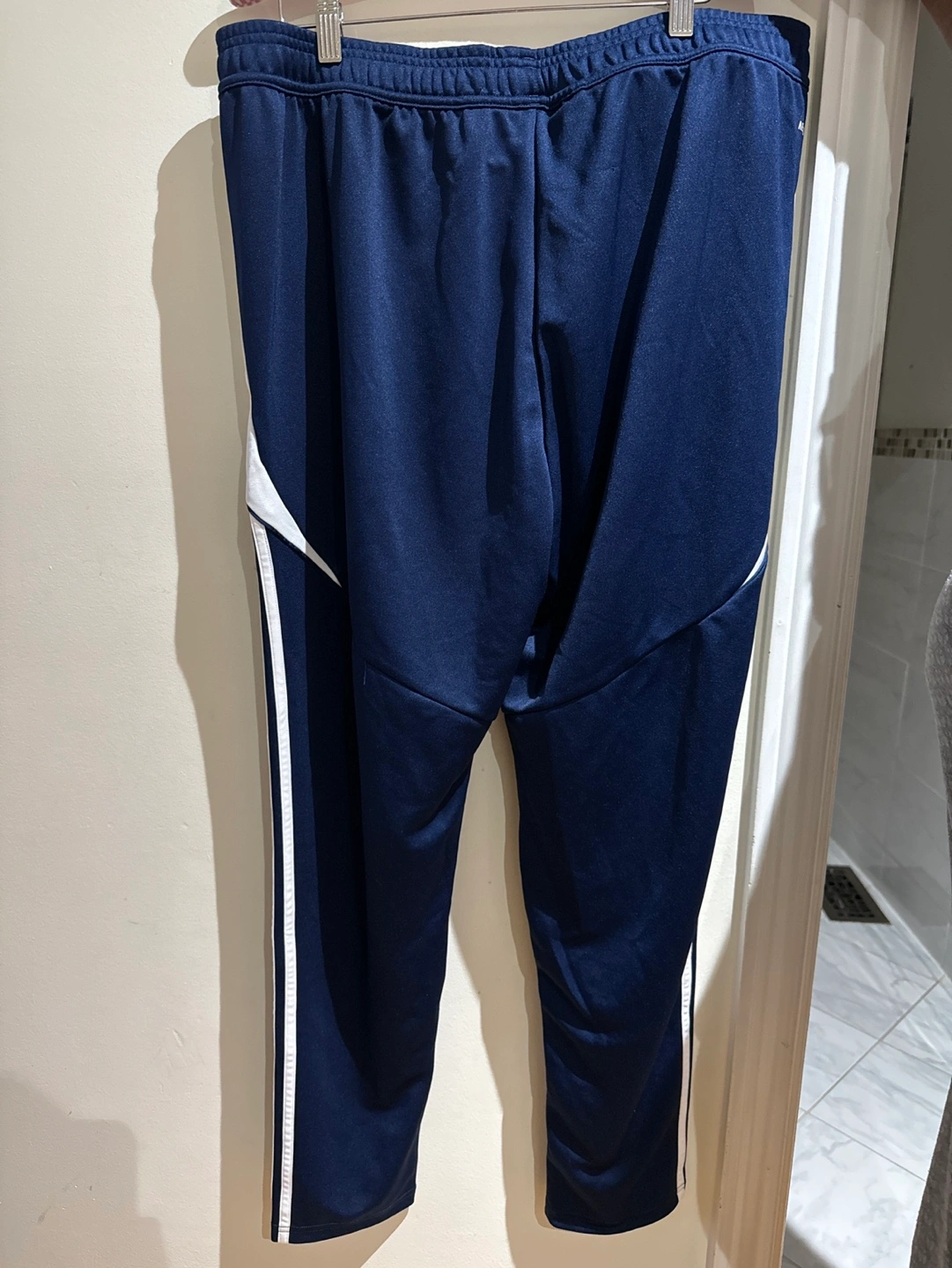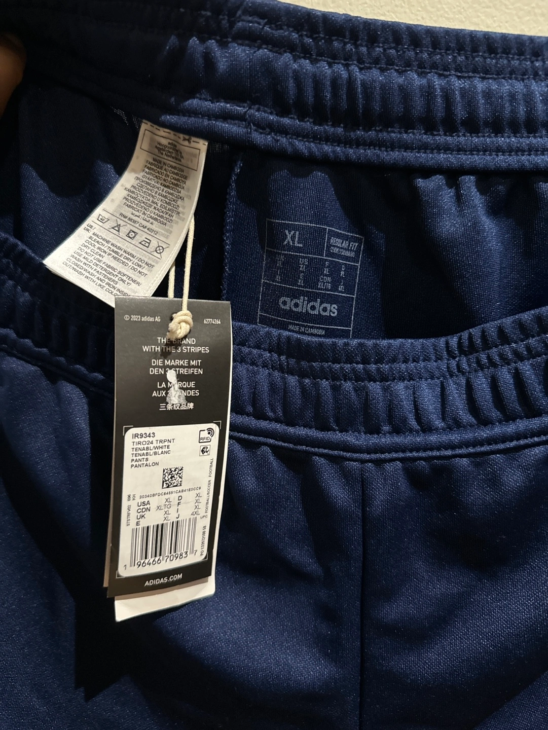New, Never worn. Men's Adidas training pants. Navy blue with white stripes. Size XL. Elastic waistband with drawstring. Zip pockets. Made in Cambodia.