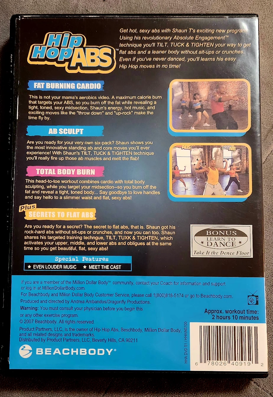 Beachbody Hip Hop Abs Workout DVDs by Shaun T.. Two DVDs, three workouts (Fat Burning Cardio, Ab Sculpt, Total Body Burn), plus Shaun's secret to flat Abs and a bonus dance lesson.